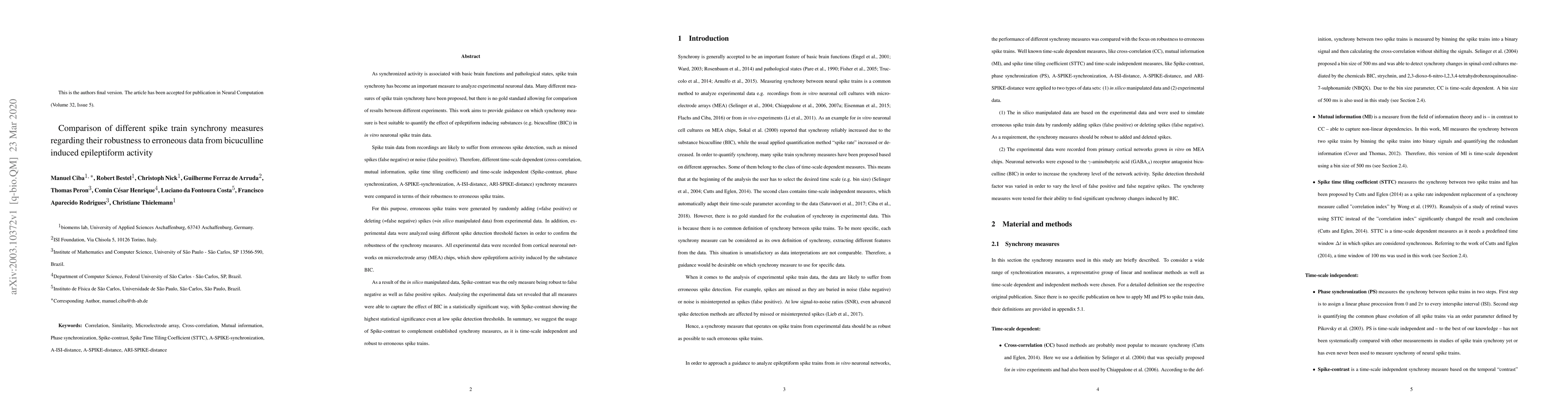 This study compares various spike train synchrony measures to determine their robustness against erroneous data from bicuculline-induced epileptiform activity. Spike-contrast emerged as the most robust measure against false negative and positive spikes, showing high statistical significance even with low spike detection thresholds.
