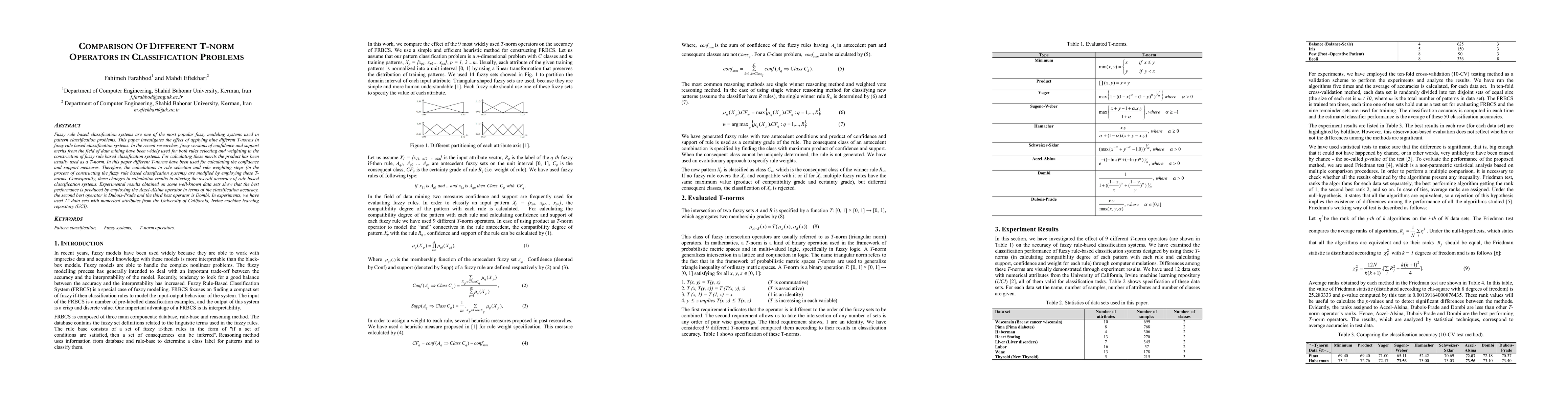 This paper investigates the impact of nine different T-norm operators on fuzzy rule-based classification systems, revealing that Aczel-Alsina operator yields the best performance, followed by Dubois-Prade and Dombi operators.