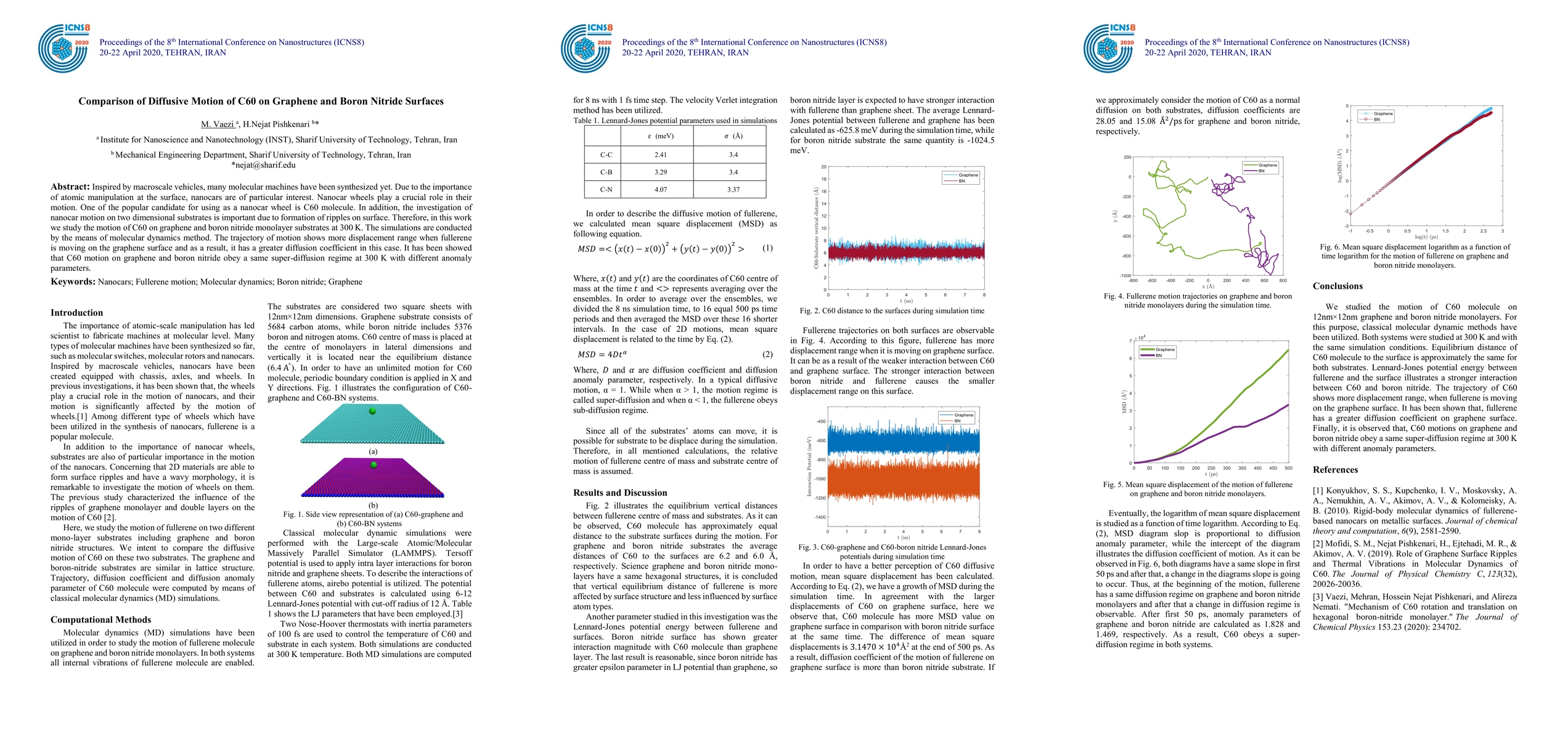 This paper investigates the diffusive motion of C60 on graphene and boron nitride surfaces using molecular dynamics simulations at 300 K. Results show that C60 exhibits greater displacement and diffusion on graphene compared to boron nitride, while both surfaces follow a super-diffusion regime with distinct anomaly parameters.