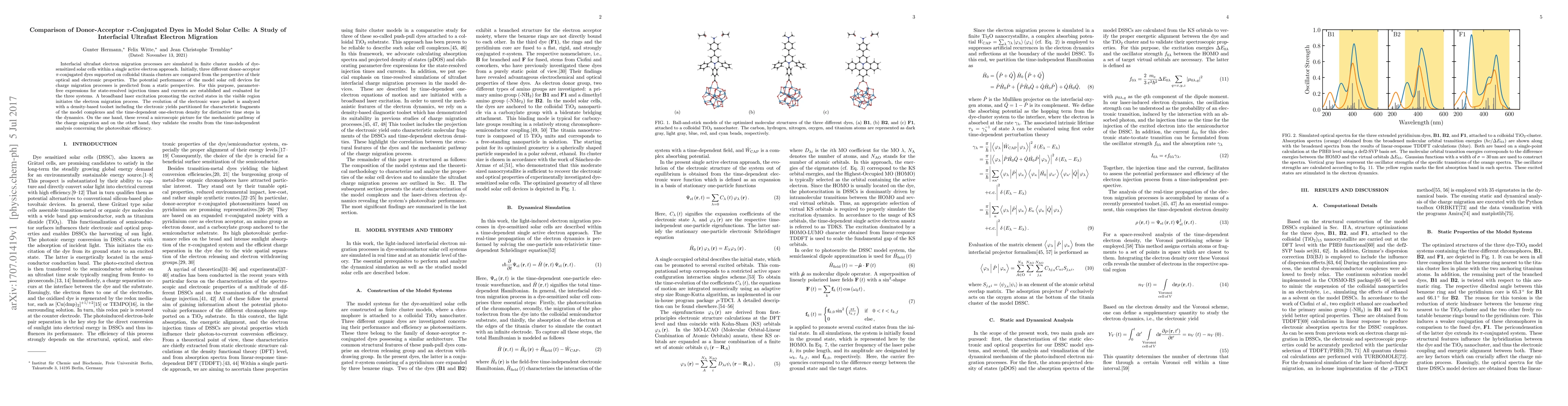 Interfacial ultrafast electron migration processes are simulated in finite cluster models of dye-sensitized solar cells within a single active electron approach. Initially, three different donor-acceptor $\pi$-conjugated dyes supported on colloidal titania clusters are compared from the perspective of their optical and electronic properties. The potential performance of the model solar cell devices for charge migration processes is predicted from a static perspective. For this purpose, parameter-free expressions for state-resolved injection times and currents are established and evaluated for the three systems. A broadband laser excitation promoting the excited states in the visible region initiates the electron migration process. The evolution of the electronic wave packet is analyzed with a density-based toolset including the electronic yields partitioned for characteristic fragments of the model complexes and the time-dependent one-electron density for distinctive time steps in the dynamics. On the one hand, these reveal a microscopic picture for the mechanistic pathway of the charge migration and on the other hand, they validate the results from the time-independent analysis concerning the photovoltaic efficiency.