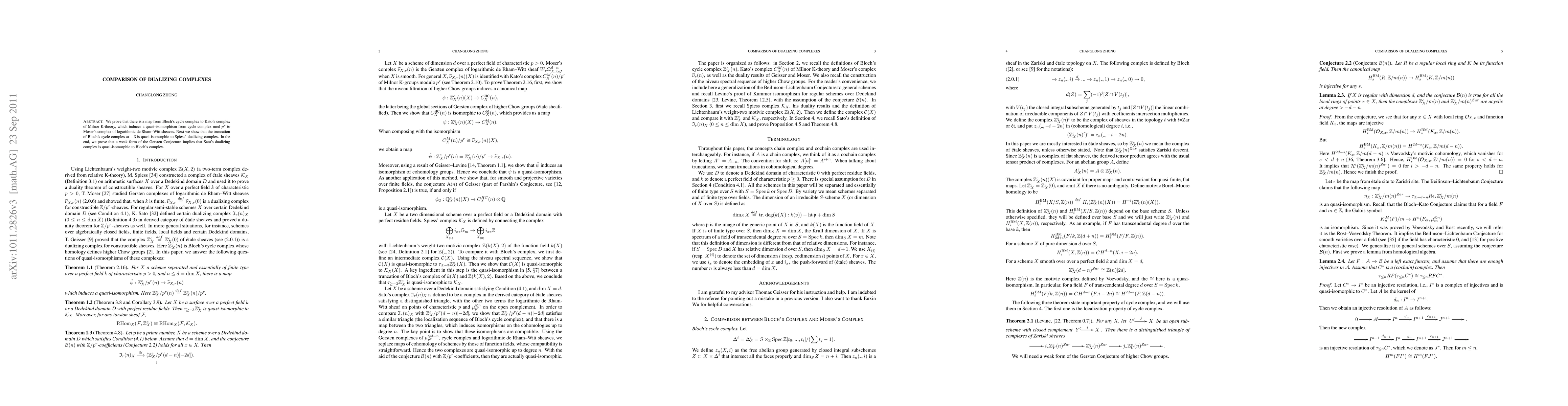 This research establishes a map between Bloch's cycle complex and Kato's Milnor K-theory complex, proving a quasi-isomorphism between sheafified cycle complex and Gersten complex of log de Rham-Witt sheaves. It also demonstrates that the truncated Bloch's cycle complex at -3 is equivalent to Spiess' dualizing complex via a quasi-isomorphism.