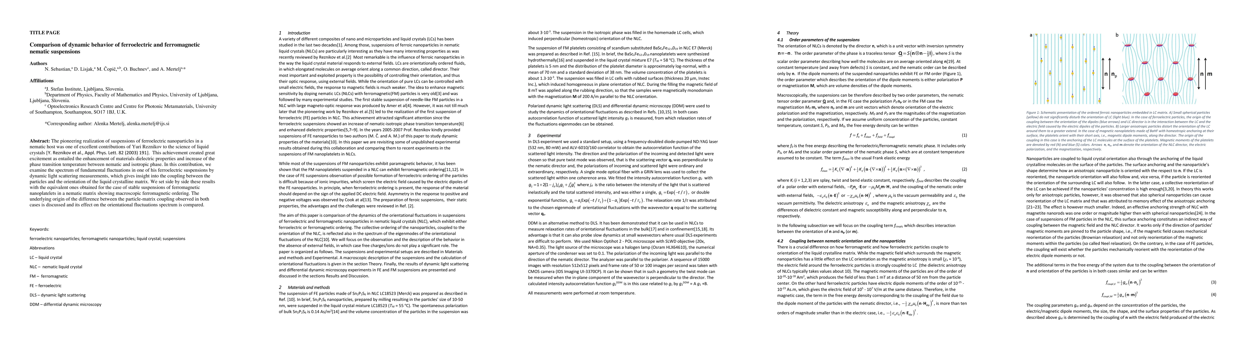 This research compares the dynamic behavior of ferroelectric nematic suspensions with that of ferromagnetic nematic suspensions using dynamic light scattering, focusing on particle-matrix coupling and orientational fluctuations. It highlights the differences in their fundamental fluctuations and discusses the implications for material properties.