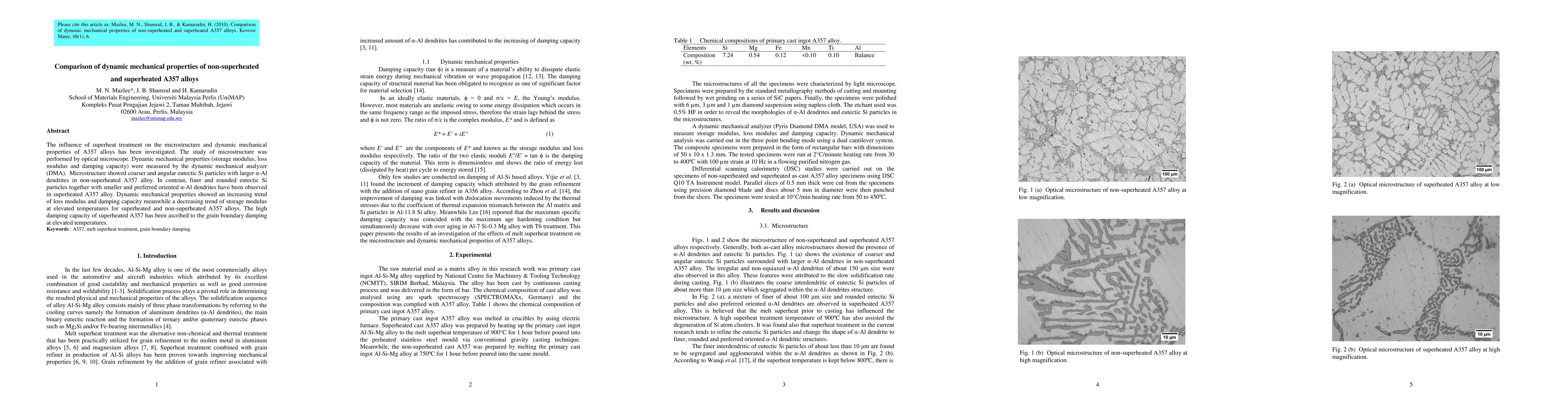 This study investigates the effects of superheat treatment on A357 alloy microstructure and dynamic mechanical properties, revealing finer, rounded eutectic Si particles and smaller, oriented α-Al dendrites in superheated alloys, which exhibit higher damping capacity and lower storage modulus at elevated temperatures.