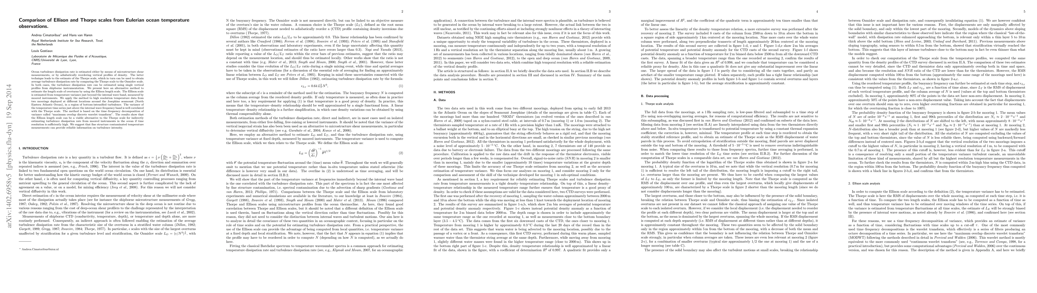 This paper compares the Ellison and Thorpe scales for estimating ocean turbulence dissipation rates using high-resolution temperature data from moorings. It finds that the Ellison scale, based on temperature variance just beyond internal wave frequencies, correlates well with the Thorpe scale, suggesting it can serve as an alternative method for estimating turbulence dissipation rates.