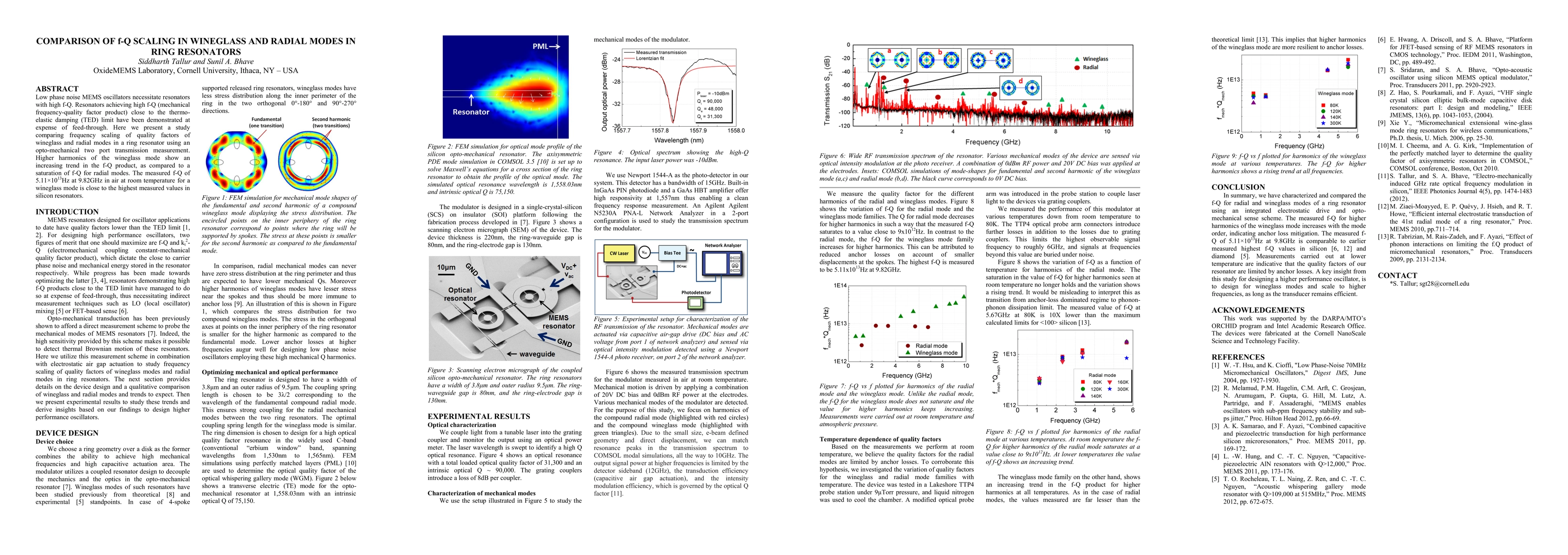 Low phase noise MEMS oscillators necessitate resonators with high f-Q. Resonators achieving high f-Q (mechanical frequency-quality factor product) close to the thermo-elastic damping (TED) limit have been demonstrated at expense of feed-through. Here we present a study comparing frequency scaling of quality factors of wineglass and radial modes in a ring resonator using an opto-mechanical two port transmission measurement. Higher harmonics of the wineglass mode show an increasing trend in the f-Q product, as compared to a saturation of f-Q for radial modes. The measured f-Q of 5.11e13Hz at 9.82GHz in air at room temperature for a wineglass mode is close to the highest measured values in silicon resonators.