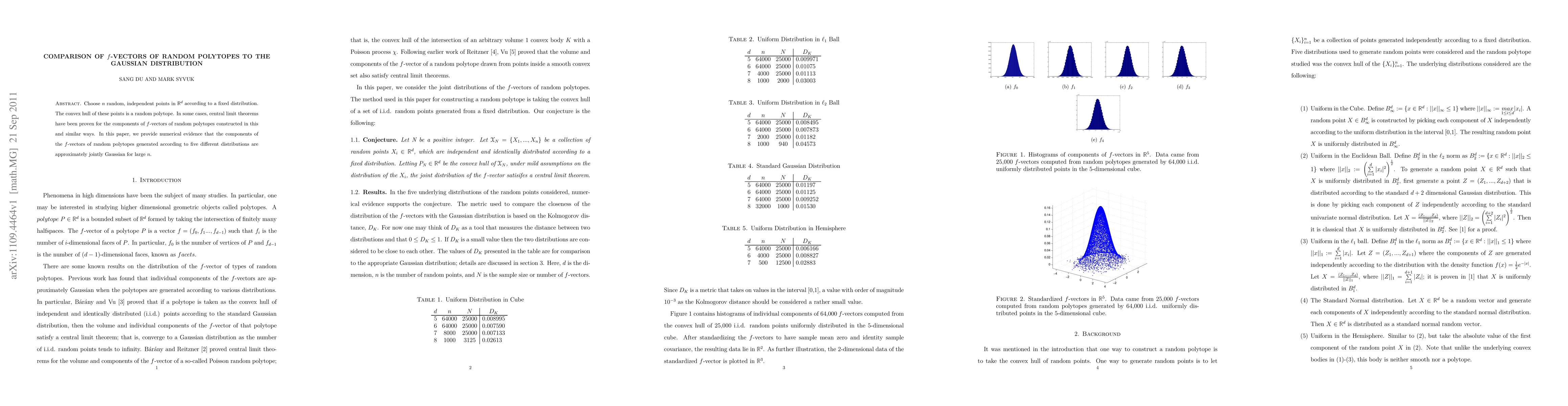 This paper investigates the f-vectors of random polytopes formed from n independent points in R^d, showing numerical evidence that their components converge to a joint Gaussian distribution for large n across five different distributions. Central limit theorems are hinted at for these f-vectors.