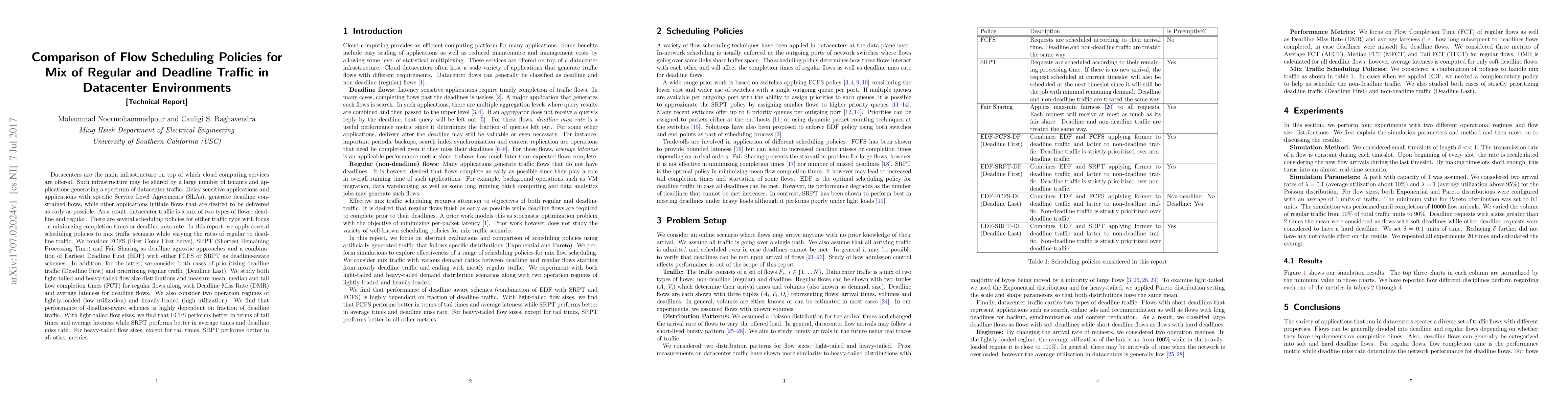 This paper compares various flow scheduling policies for mixed deadline and regular traffic in datacenters, evaluating FCFS, SRPT, Fair Sharing, and EDF-based approaches under different traffic ratios and flow size distributions. Results show that deadline-aware schemes perform better with higher deadline traffic fractions, while FCFS and SRPT excel in different metrics depending on the traffic mix and flow size distribution.