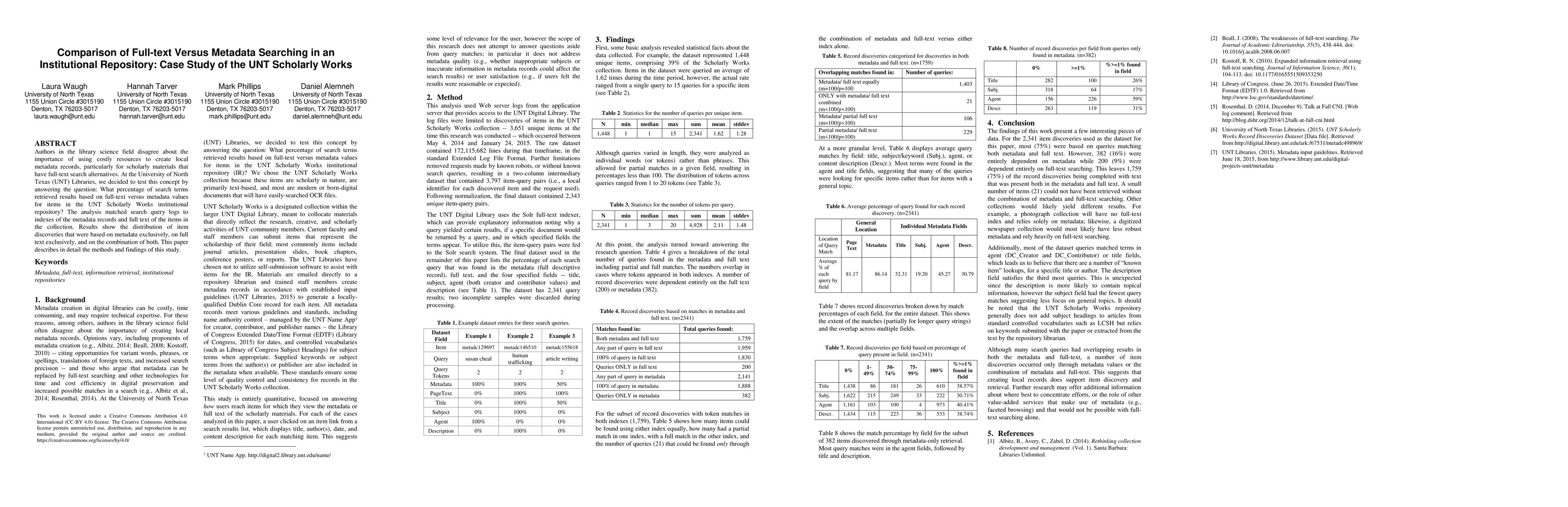 This study compares full-text and metadata searching in the UNT Scholarly Works repository, finding that a significant portion of search results were retrieved through full-text search, raising questions about the necessity of costly metadata records. The analysis revealed distinct distributions of item discoveries based on metadata, full text, or both.