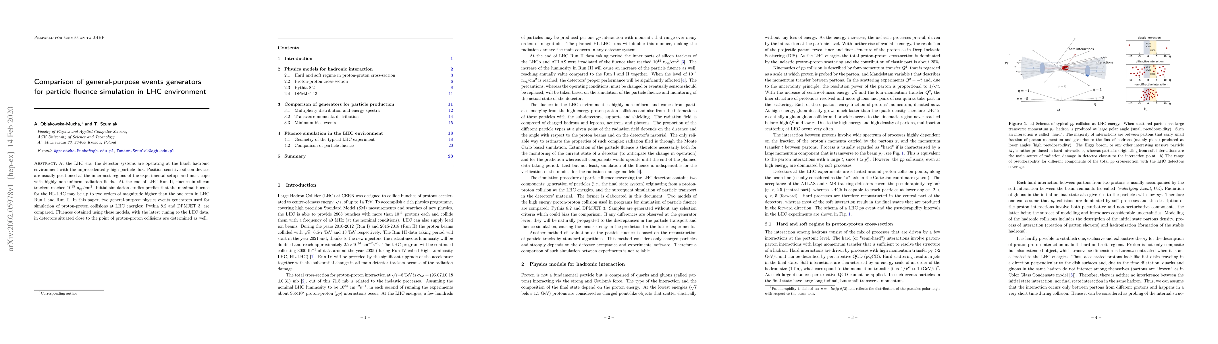 At the LHC era, the detector systems are operating at the harsh hadronic environment with the unprecedentedly high particle flux. Position sensitive silicon devices are usually positioned at the innermost regions of the experimental setups and must cope with highly non-uniform radiation fields. At the end of LHC Run II, fluence in silicon trackers reached 10$^{15}$ n$_{eq}$/cm$^2$. Initial simulation studies predict that the maximal fluence for the HL-LHC may be up to two orders of magnitude higher than the one seen in LHC Run I and Run II. In this paper, two general-purpose physics events generators used for simulation of proton-proton collisions at LHC energies: Pythia 8.2 and DPMJET 3, are compared. Fluences obtained using these models, with the latest tuning to the LHC data, in detectors situated close to the point of proton-proton collisions are determined as well.
