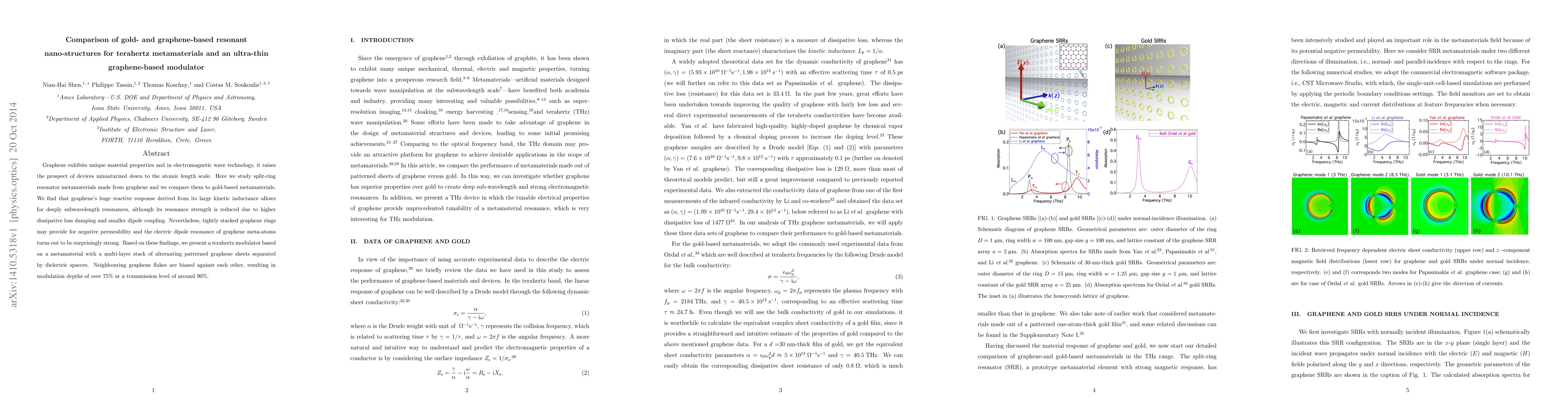 This paper compares graphene-based split-ring resonator metamaterials to gold-based counterparts, finding that while graphene offers deeply subwavelength resonances, it suffers from higher dissipative losses. The study concludes with the development of a terahertz modulator using a multi-layer graphene metamaterial achieving over 75% modulation depth at 90% transmission.