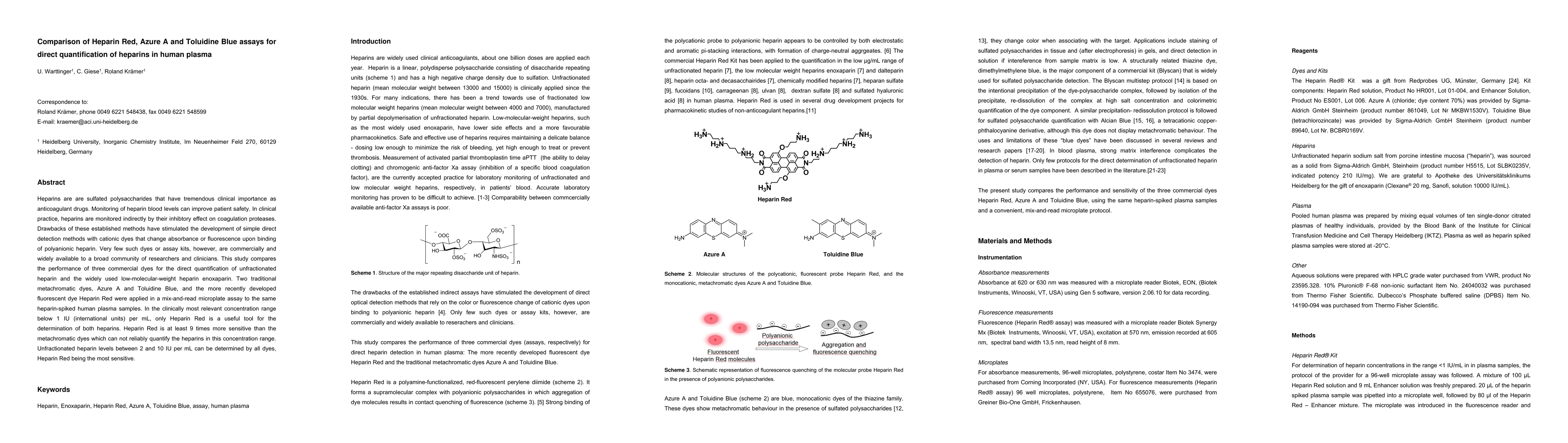 This study compares the performance of three commercial dyes—Heparin Red, Azure A, and Toluidine Blue—for direct quantification of heparins in human plasma, finding that Heparin Red is significantly more sensitive, especially in the clinically relevant concentration range below 1 IU per mL, compared to the metachromatic dyes.
