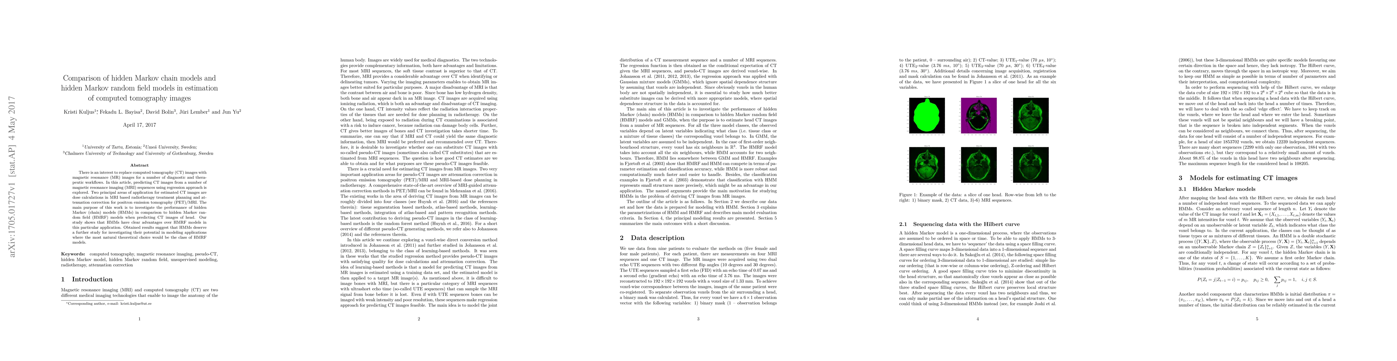 There is an interest to replace computed tomography (CT) images with magnetic resonance (MR) images for a number of diagnostic and therapeutic workflows. In this article, predicting CT images from a number of magnetic resonance imaging (MRI) sequences using regression approach is explored. Two principal areas of application for estimated CT images are dose calculations in MRI-based radiotherapy treatment planning and attenuation correction for positron emission tomography (PET)/MRI. The main purpose of this work is to investigate the performance of hidden Markov (chain) models (HMMs) in comparison to hidden Markov random field (HMRF) models when predicting CT images of head. Our study shows that HMMs have clear advantages over HMRF models in this particular application. Obtained results suggest that HMMs deserve a further study for investigating their potential in modelling applications where the most natural theoretical choice would be the class of HMRF models.