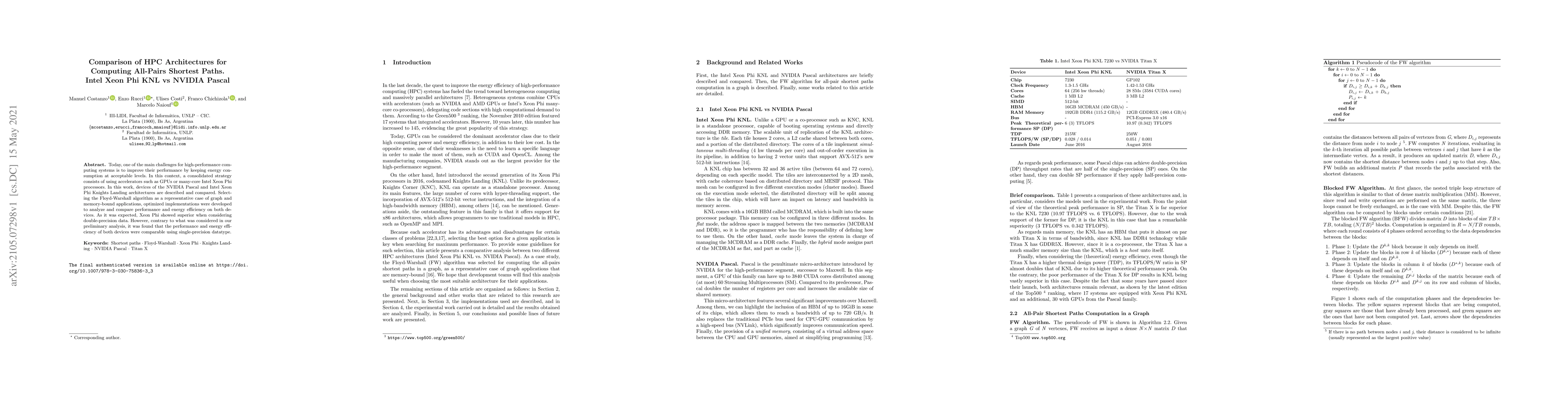 This study compares the performance and energy efficiency of the Intel Xeon Phi KNL and the NVIDIA Pascal architecture using the Floyd-Warshall algorithm. The Intel Xeon Phi excelled with double-precision data, but both architectures showed comparable performance and energy efficiency with single-precision data.