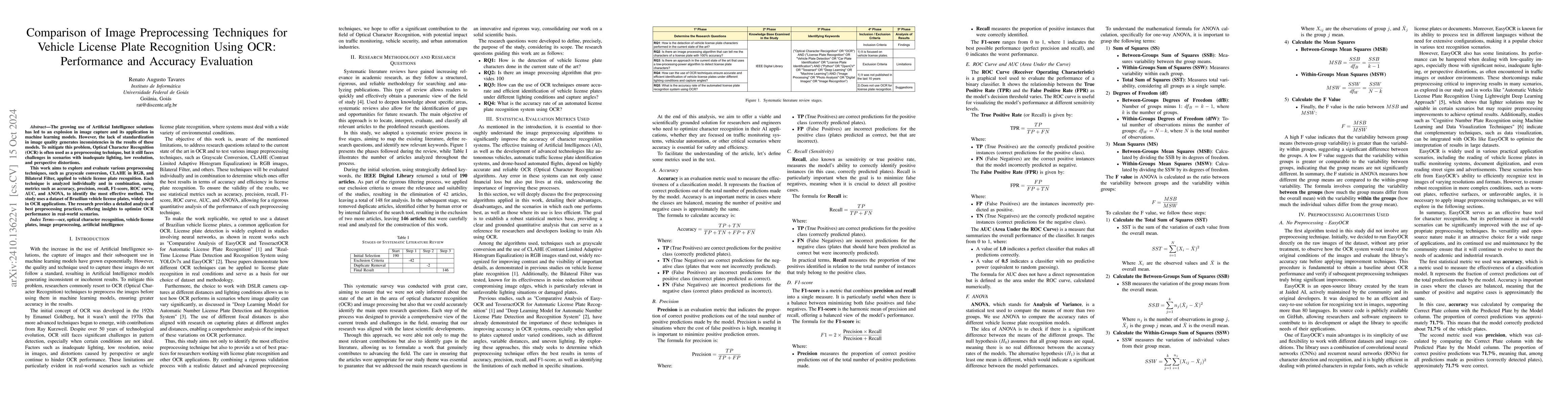 The growing use of Artificial Intelligence solutions has led to an explosion in image capture and its application in machine learning models. However, the lack of standardization in image quality generates inconsistencies in the results of these models. To mitigate this problem, Optical Character Recognition (OCR) is often used as a preprocessing technique, but it still faces challenges in scenarios with inadequate lighting, low resolution, and perspective distortions. This work aims to explore and evaluate various preprocessing techniques, such as grayscale conversion, CLAHE in RGB, and Bilateral Filter, applied to vehicle license plate recognition. Each technique is analyzed individually and in combination, using metrics such as accuracy, precision, recall, F1-score, ROC curve, AUC, and ANOVA, to identify the most effective method. The study uses a dataset of Brazilian vehicle license plates, widely used in OCR applications. The research provides a detailed analysis of best preprocessing practices, offering insights to optimize OCR performance in real-world scenarios.