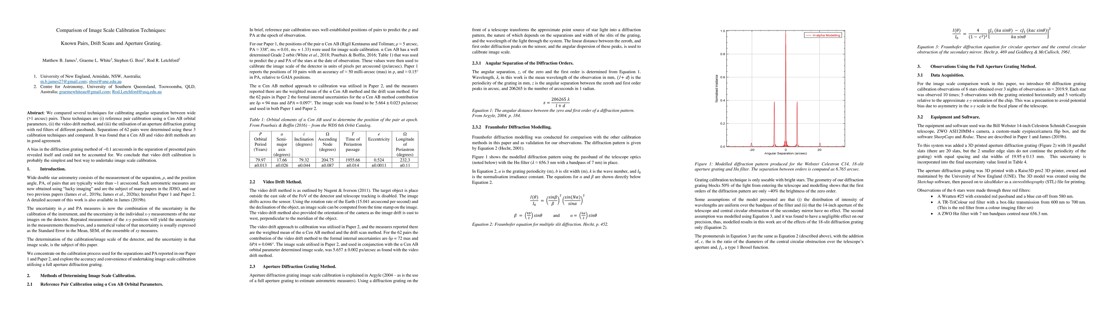 We compared several techniques for calibrating angular separation between wide (>1 arcsec) pairs. These techniques are (i) reference pair calibration using {\alpha} Cen AB orbital parameters, (ii) the video drift method, and (iii) the utilisation of an aperture diffraction grating with red filters of different passbands. Separations of 62 pairs were determined using these 3 calibration techniques and compared. It was found that {\alpha} Cen AB and video drift methods are in good agreement. The use of the grating and filter (by measuring fringe spacing) proved unsatisfactory for the broad-band filters, and the use of a narrow band H{\alpha} filter with the grating, resulted in image scales that differed from those obtained using {\alpha} Cen AB reference pair calibration and the video drift method by 0.024 and 0.031 pixel/arcsec (px/arcsec) respectively. A more complete modelling of Fraunhofer diffraction of the H{\alpha} filter and grating produced a difference in image scale of 0.009 px/arcsec. A bias in the diffraction grating method of ~0.1% in the separation of pairs also revealed itself and could not be accounted for. We conclude that calibration against a known pair for which the separation and PA is known with high precision is probably the simplest and best way to undertake image scale calibration.