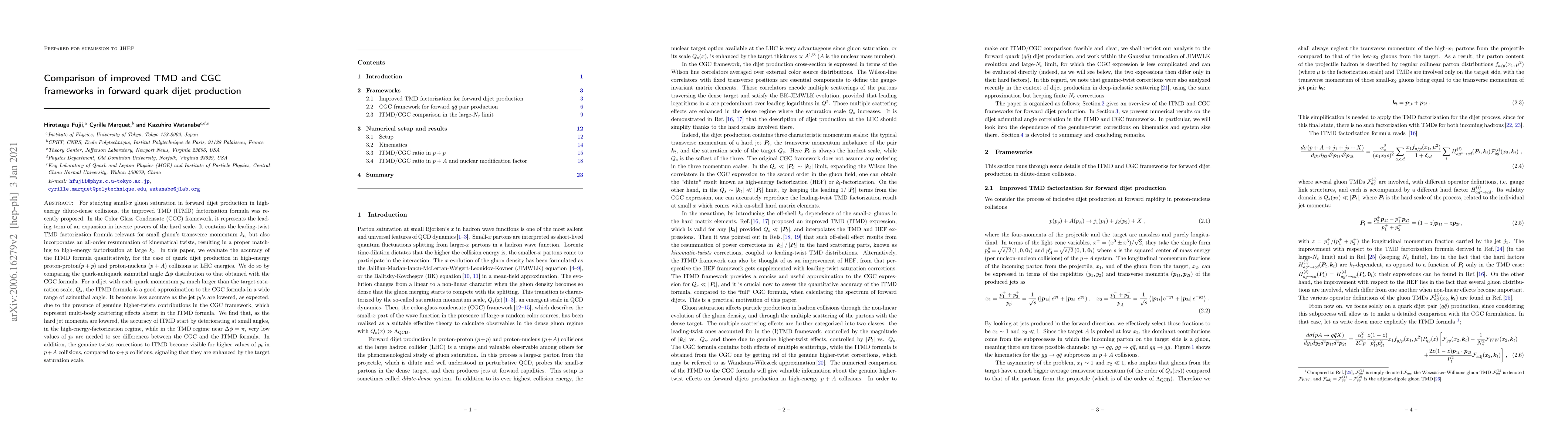 For studying small-$x$ gluon saturation in forward dijet production in high-energy dilute-dense collisions, the improved TMD (ITMD) factorization formula was recently proposed. In the Color Glass Condensate (CGC) framework, it represents the leading term of an expansion in inverse powers of the hard scale. It contains the leading-twist TMD factorization formula relevant for small gluon's transverse momentum $k_t$, but also incorporates an all-order resummation of kinematical twists, resulting in a proper matching to high-energy factorization at large $k_t$. In this paper, we evaluate the accuracy of the ITMD formula quantitatively, for the case of quark dijet production in high-energy proton-proton($p+p$) and proton-nucleus ($p+A$) collisions at LHC energies. We do so by comparing the quark-antiquark azimuthal angle $\Delta\phi$ distribution to that obtained with the CGC formula. For a dijet with each quark momentum $p_t$ much larger than the target saturation scale, $Q_s$, the ITMD formula is a good approximation to the CGC formula in a wide range of azimuthal angle. It becomes less accurate as the jet $p_t$'s are lowered, as expected, due to the presence of genuine higher-twists contributions in the CGC framework, which represent multi-body scattering effects absent in the ITMD formula. We find that, as the hard jet momenta are lowered, the accuracy of ITMD start by deteriorating at small angles, in the high-energy-factorization regime, while in the TMD regime near $\Delta\phi=\pi$, very low values of $p_t$ are needed to see differences between the CGC and the ITMD formula. In addition, the genuine twists corrections to ITMD become visible for higher values of $p_t$ in $p+A$ collisions, compared to $p+p$ collisions, signaling that they are enhanced by the target saturation scale.