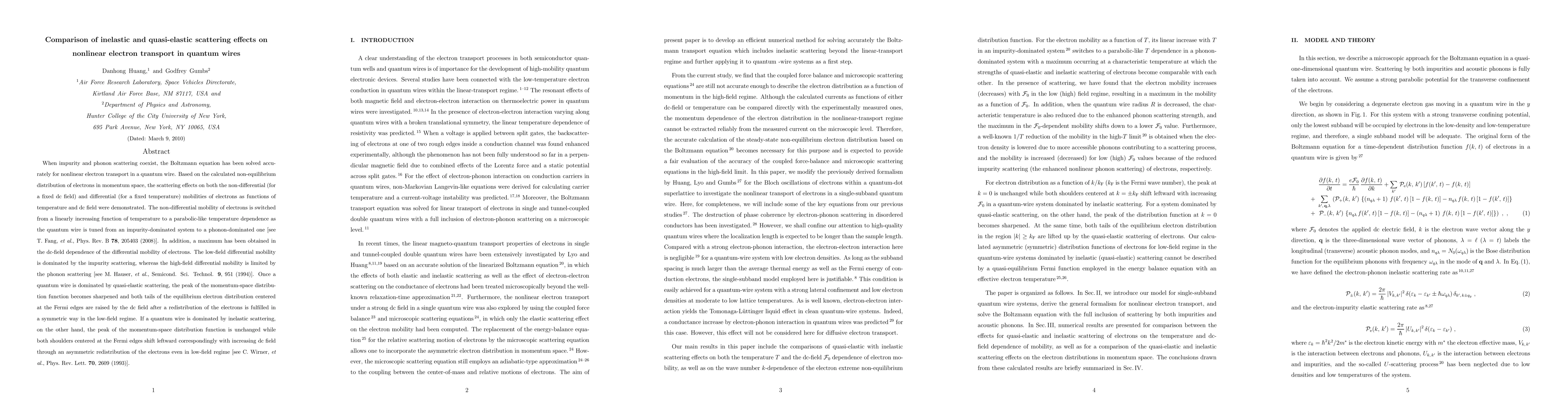 This paper investigates the effects of inelastic and quasi-elastic scattering on nonlinear electron transport in quantum wires under the influence of impurity and phonon scattering. It demonstrates that the non-differential mobility changes from linear to parabolic with temperature, and the differential mobility is dominated by impurity scattering at low fields and phonon scattering at high fields.