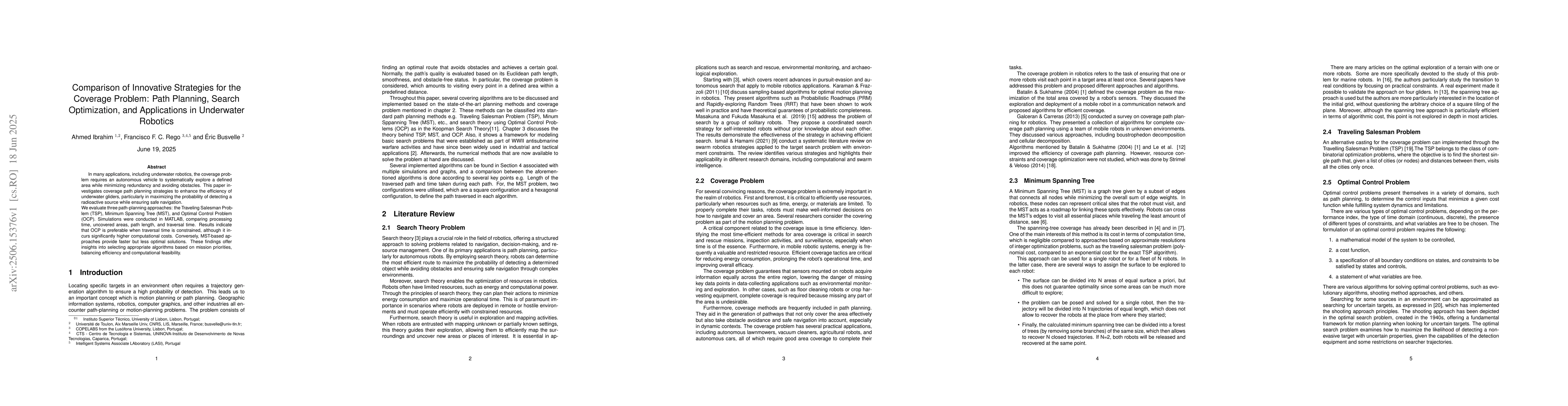 In many applications, including underwater robotics, the coverage problem requires an autonomous vehicle to systematically explore a defined area while minimizing redundancy and avoiding obstacles. This paper investigates coverage path planning strategies to enhance the efficiency of underwater gliders, particularly in maximizing the probability of detecting a radioactive source while ensuring safe navigation. We evaluate three path-planning approaches: the Traveling Salesman Problem (TSP), Minimum Spanning Tree (MST), and Optimal Control Problem (OCP). Simulations were conducted in MATLAB, comparing processing time, uncovered areas, path length, and traversal time. Results indicate that OCP is preferable when traversal time is constrained, although it incurs significantly higher computational costs. Conversely, MST-based approaches provide faster but less optimal solutions. These findings offer insights into selecting appropriate algorithms based on mission priorities, balancing efficiency and computational feasibility.