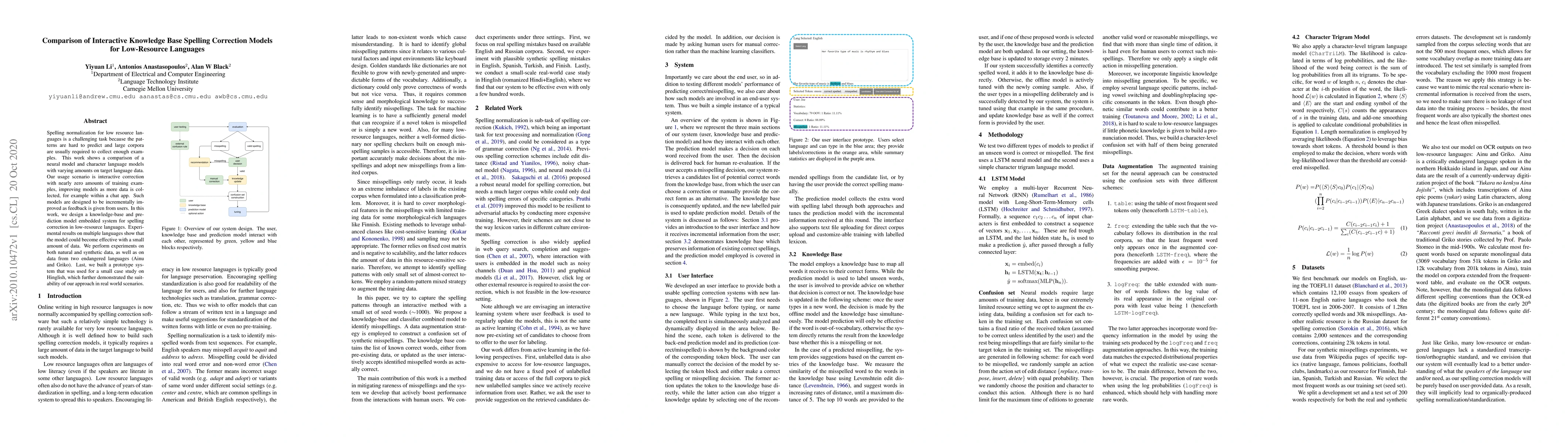 Spelling normalization for low resource languages is a challenging task because the patterns are hard to predict and large corpora are usually required to collect enough examples. This work shows a comparison of a neural model and character language models with varying amounts on target language data. Our usage scenario is interactive correction with nearly zero amounts of training examples, improving models as more data is collected, for example within a chat app. Such models are designed to be incrementally improved as feedback is given from users. In this work, we design a knowledge-base and prediction model embedded system for spelling correction in low-resource languages. Experimental results on multiple languages show that the model could become effective with a small amount of data. We perform experiments on both natural and synthetic data, as well as on data from two endangered languages (Ainu and Griko). Last, we built a prototype system that was used for a small case study on Hinglish, which further demonstrated the suitability of our approach in real world scenarios.