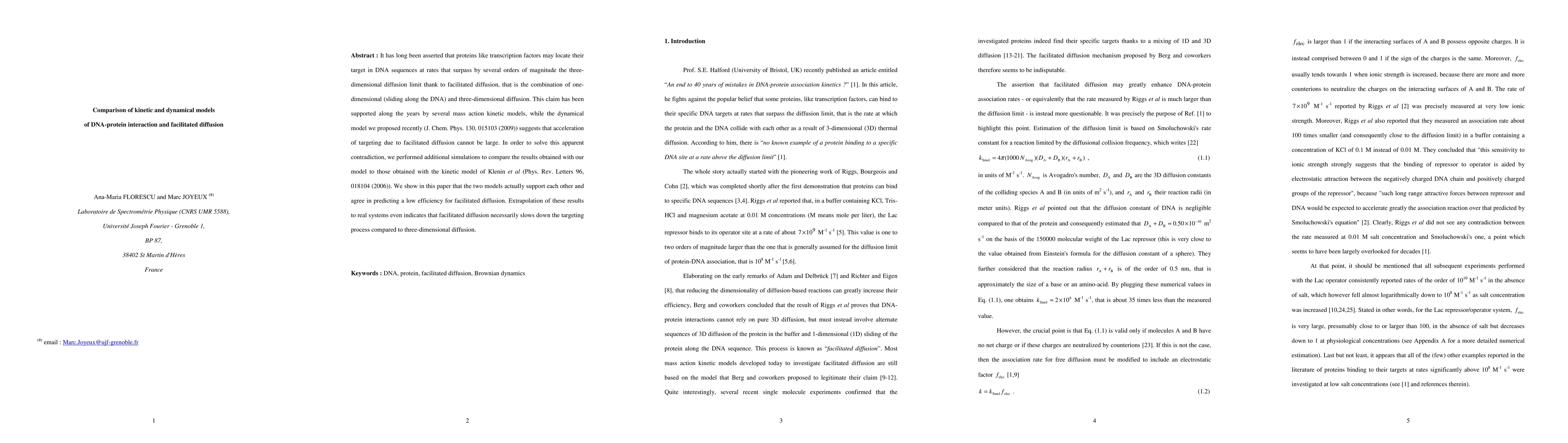 This paper compares kinetic and dynamical models of DNA-protein interaction, finding that both models predict a low efficiency for facilitated diffusion, suggesting that it may actually slow down the targeting process compared to three-dimensional diffusion.