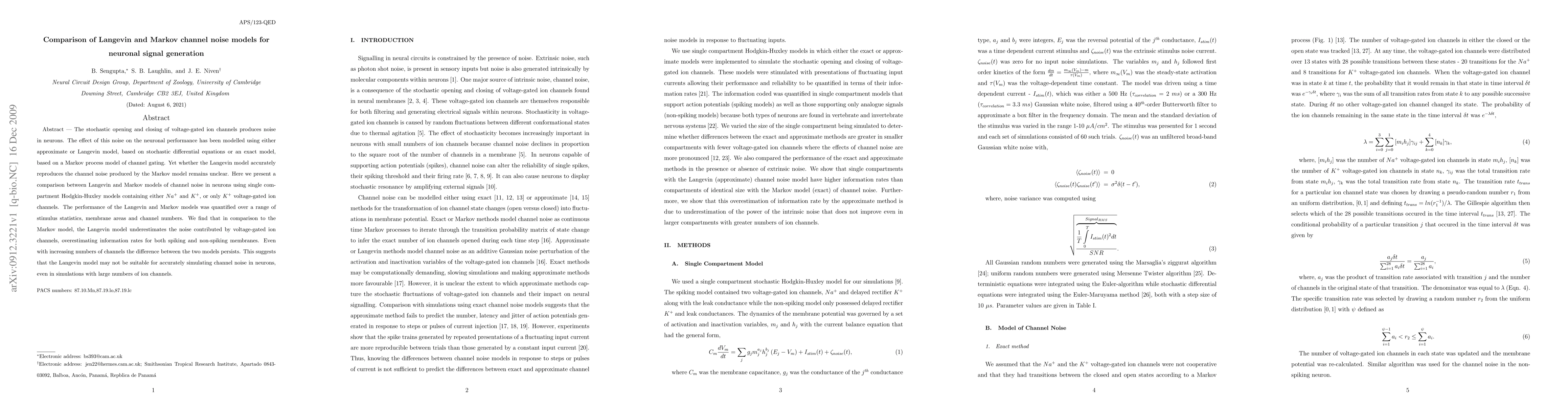 The stochastic opening and closing of voltage-gated ion channels produces noise in neurons. The effect of this noise on the neuronal performance has been modelled using either approximate or Langevin model, based on stochastic differential equations or an exact model, based on a Markov process model of channel gating. Yet whether the Langevin model accurately reproduces the channel noise produced by the Markov model remains unclear. Here we present a comparison between Langevin and Markov models of channel noise in neurons using single compartment Hodgkin-Huxley models containing either $Na^{+}$ and $K^{+}$, or only $K^{+}$ voltage-gated ion channels. The performance of the Langevin and Markov models was quantified over a range of stimulus statistics, membrane areas and channel numbers. We find that in comparison to the Markov model, the Langevin model underestimates the noise contributed by voltage-gated ion channels, overestimating information rates for both spiking and non-spiking membranes. Even with increasing numbers of channels the difference between the two models persists. This suggests that the Langevin model may not be suitable for accurately simulating channel noise in neurons, even in simulations with large numbers of ion channels.