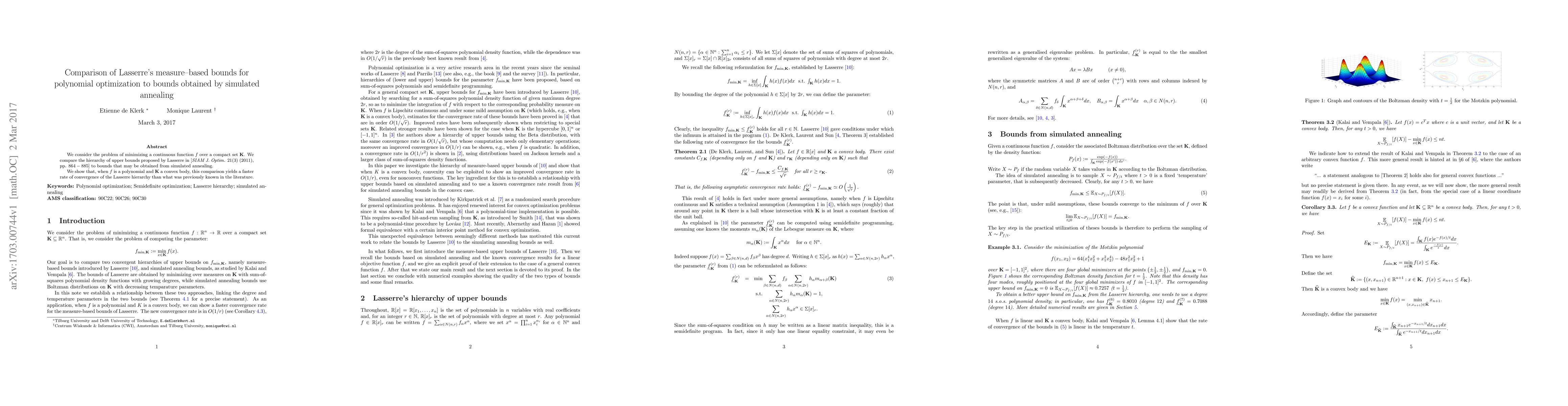 This paper compares Lasserre's measure-based bounds for polynomial optimization with bounds from simulated annealing, demonstrating that Lasserre's method converges faster when minimizing polynomial functions over convex sets.