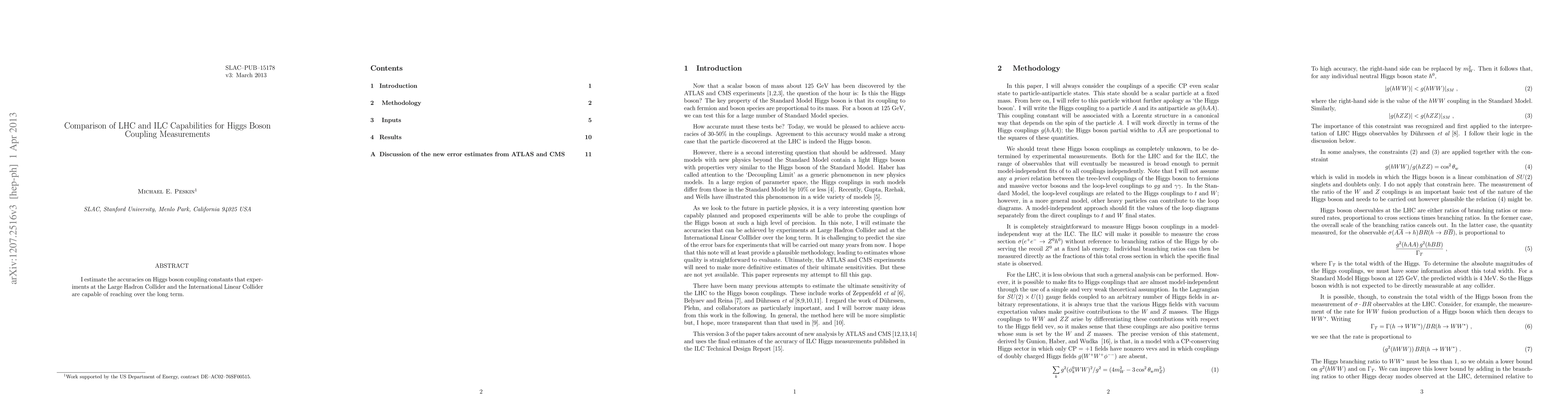 This paper compares the long-term precision of Higgs boson coupling measurements that can be achieved by the Large Hadron Collider (LHC) and the International Linear Collider (ILC), highlighting the respective capabilities of these two experimental setups.