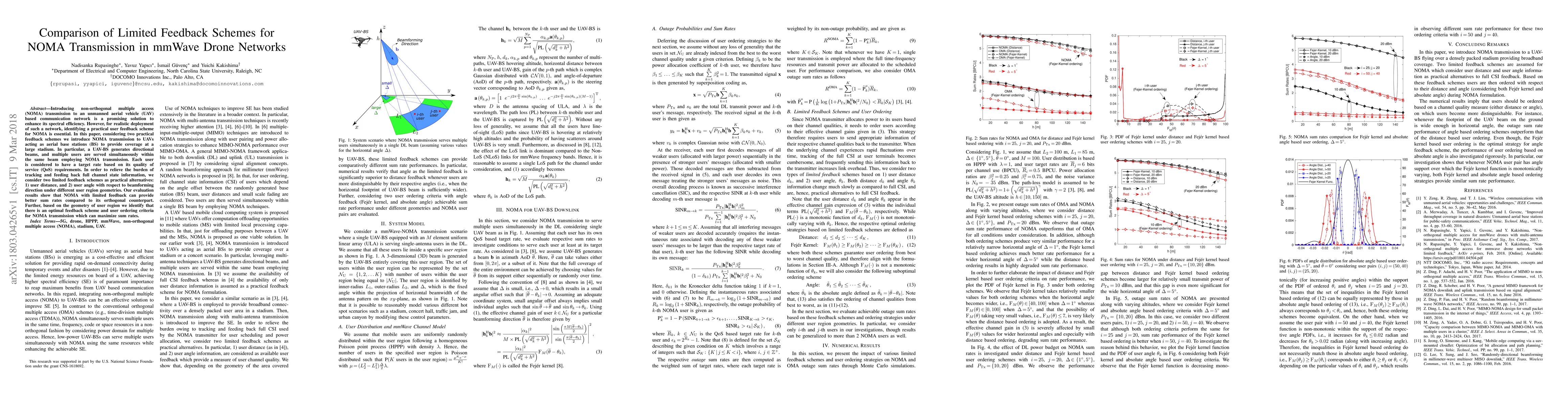 This paper compares two limited feedback schemes for NOMA transmission in mmWave drone networks, showing that NOMA with limited feedback can achieve better sum rates than orthogonal methods. The optimal feedback scheme and user ordering criteria are identified based on user region geometry to maximize sum rates.