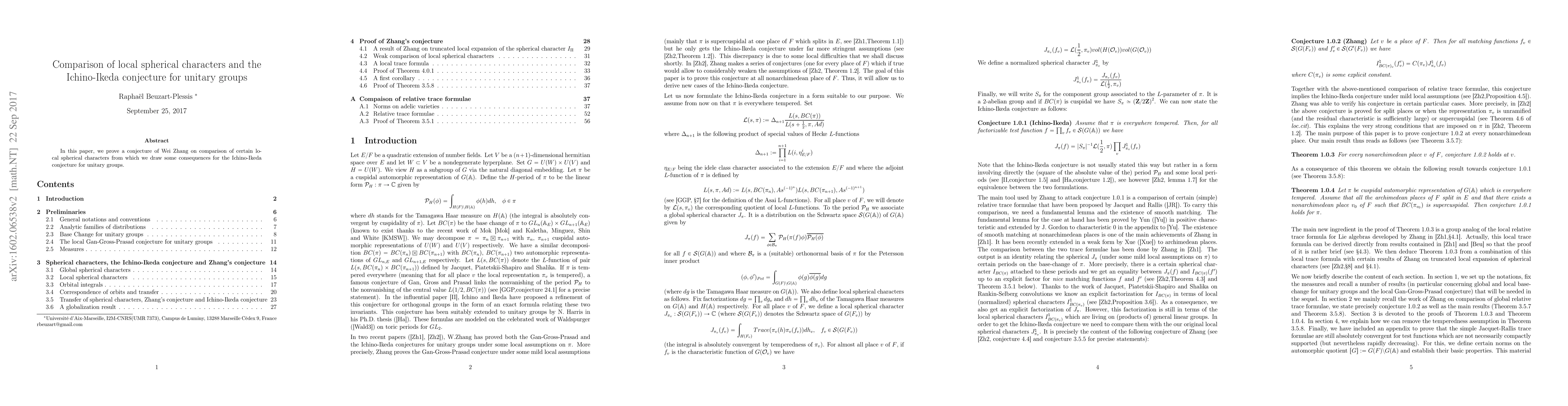 Summary: This paper proves Wei Zhang's conjecture regarding the comparison of local spherical characters, leading to implications for the Ichino-Ikeda conjecture in the context of unitary groups.