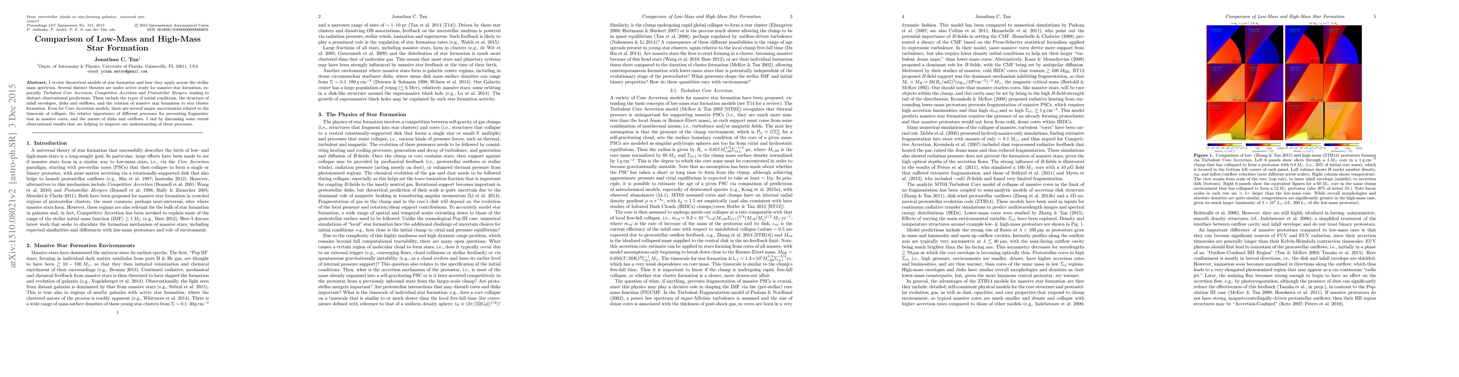 The paper reviews theoretical models of star formation, focusing on low-mass and high-mass scenarios, and compares distinct theories for massive star formation like Turbulent Core Accretion, Competitive Accretion, and Protostellar Mergers.