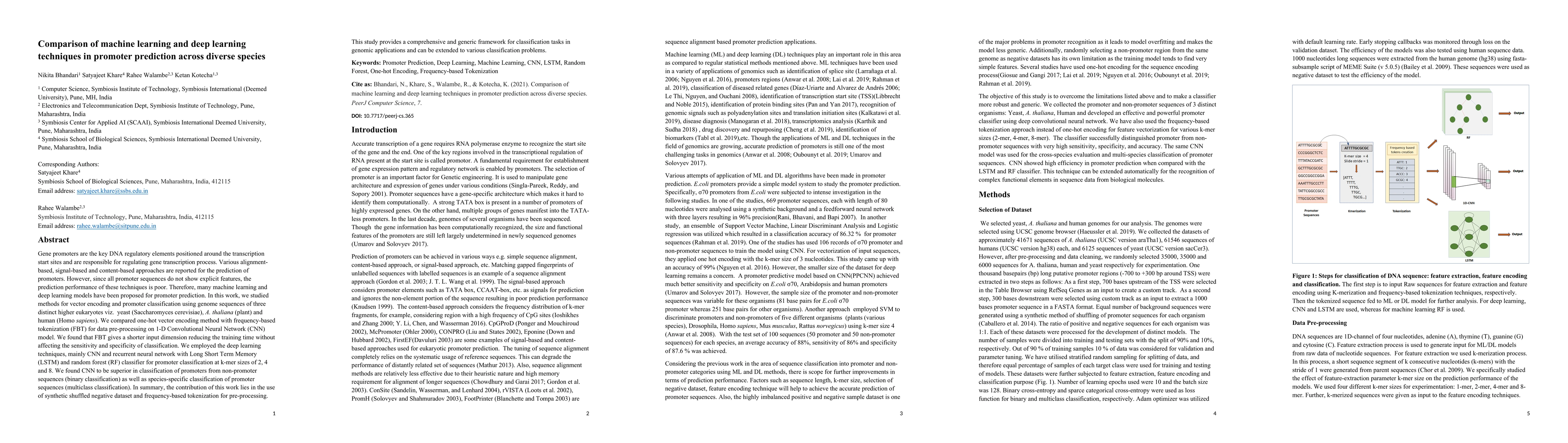 This research compares machine learning and deep learning techniques for promoter prediction across yeast, plant, and human genomes. The study found that frequency-based tokenization (FBT) for data pre-processing and Convolutional Neural Networks (CNN) outperformed other methods in promoter classification, offering a robust framework for genomic applications. For more details, refer to the original paper.