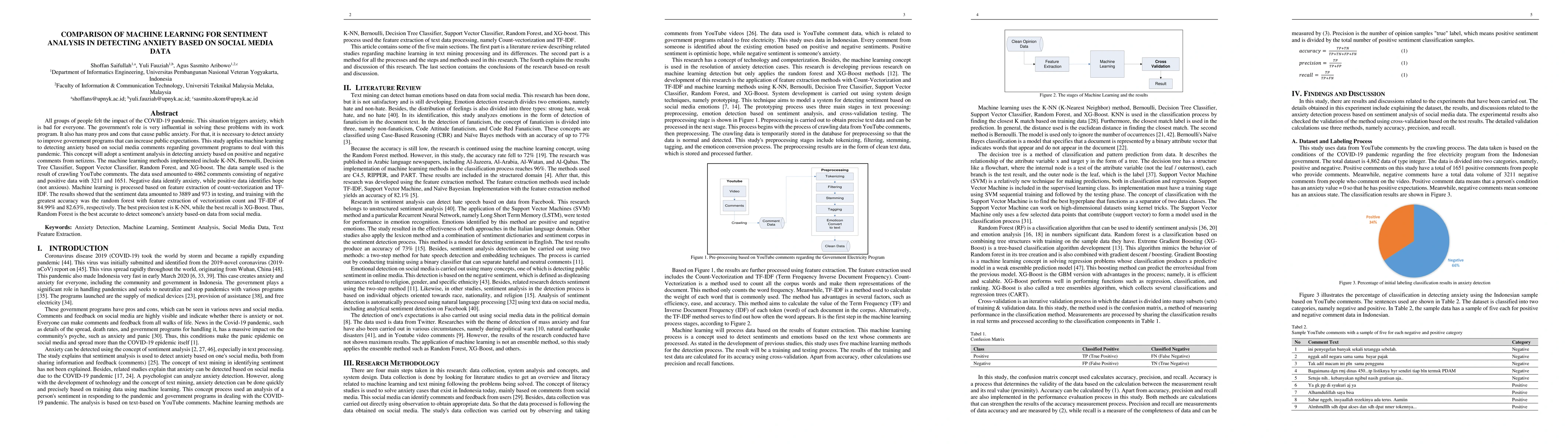 All groups of people felt the impact of the COVID-19 pandemic. This situation triggers anxiety, which is bad for everyone. The government's role is very influential in solving these problems with its work program. It also has many pros and cons that cause public anxiety. For that, it is necessary to detect anxiety to improve government programs that can increase public expectations. This study applies machine learning to detecting anxiety based on social media comments regarding government programs to deal with this pandemic. This concept will adopt a sentiment analysis in detecting anxiety based on positive and negative comments from netizens. The machine learning methods implemented include K-NN, Bernoulli, Decision Tree Classifier, Support Vector Classifier, Random Forest, and XG-boost. The data sample used is the result of crawling YouTube comments. The data used amounted to 4862 comments consisting of negative and positive data with 3211 and 1651. Negative data identify anxiety, while positive data identifies hope (not anxious). Machine learning is processed based on feature extraction of count-vectorization and TF-IDF. The results showed that the sentiment data amounted to 3889 and 973 in testing, and training with the greatest accuracy was the random forest with feature extraction of vectorization count and TF-IDF of 84.99% and 82.63%, respectively. The best precision test is K-NN, while the best recall is XG-Boost. Thus, Random Forest is the best accurate to detect someone's anxiety based-on data from social media.