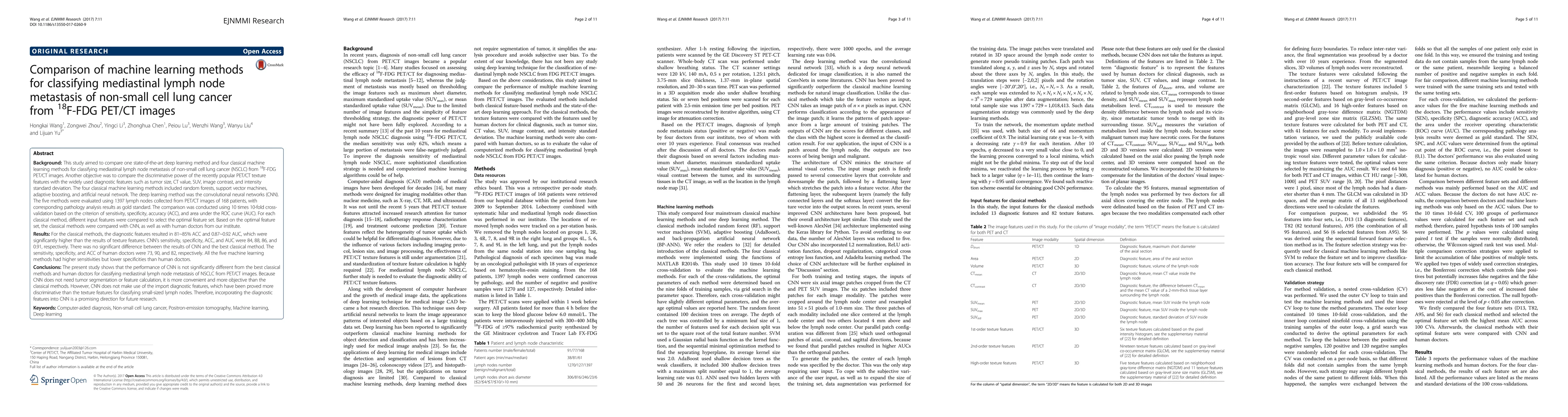 The present study shows that the performance of CNN is not significantly different from the best classical methods and human doctors for classifying mediastinal lymph node metastasis of NSCLC from PET/CT images. Because CNN does not need tumor segmentation or feature calculation, it is more convenient and more objective than the classical methods. However, CNN does not make use of the import diagnostic features, which have been proved more discriminative than the texture features for classifying small-sized lymph nodes. Therefore, incorporating the diagnostic features into CNN is a promising direction for future research.