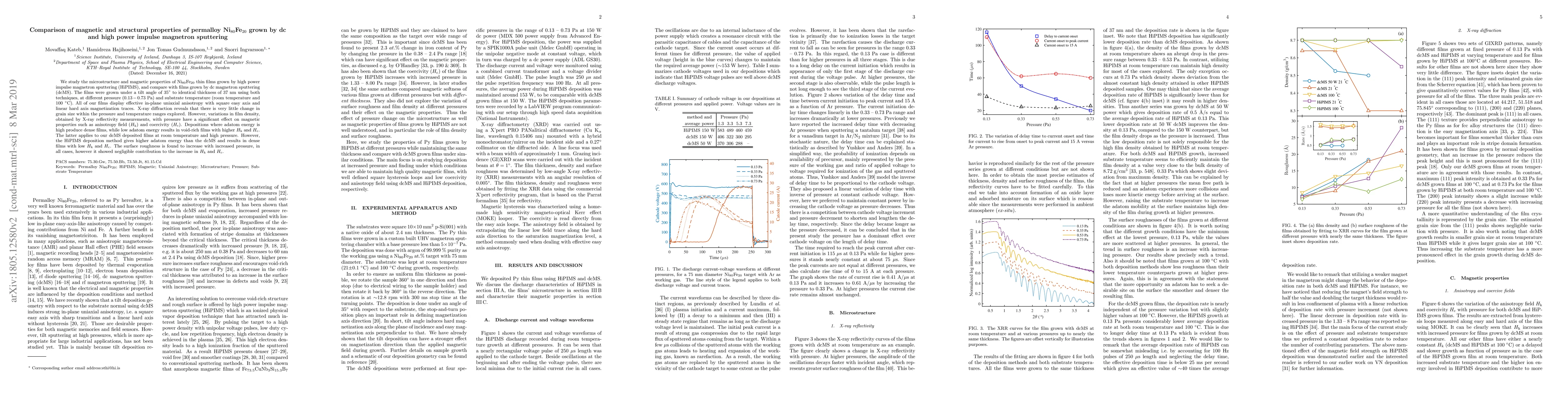 This paper compares the magnetic and structural properties of Ni80Fe20 thin films grown using high power impulse magnetron sputtering (HiPIMS) and dc magnetron sputtering (dcMS). The study finds that HiPIMS produces denser films with lower anisotropy and coercivity, while dcMS at room temperature and high pressure yields void-rich films with higher anisotropy and coercivity.