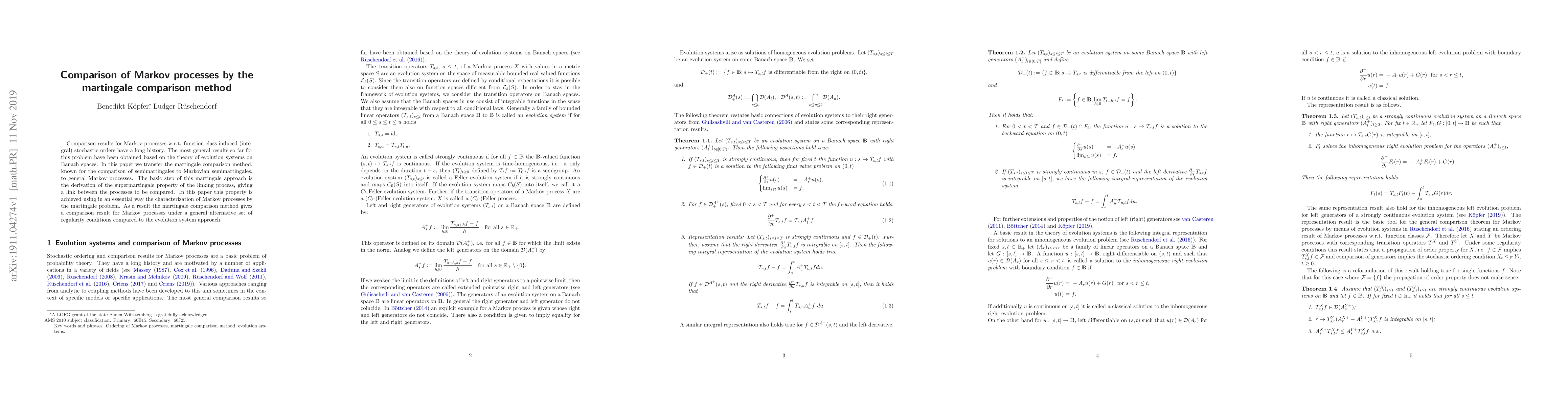 This paper extends the martingale comparison method to general Markov processes, deriving a supermartingale property for linking processes and providing a new comparison framework under different regularity conditions compared to the evolution system approach.