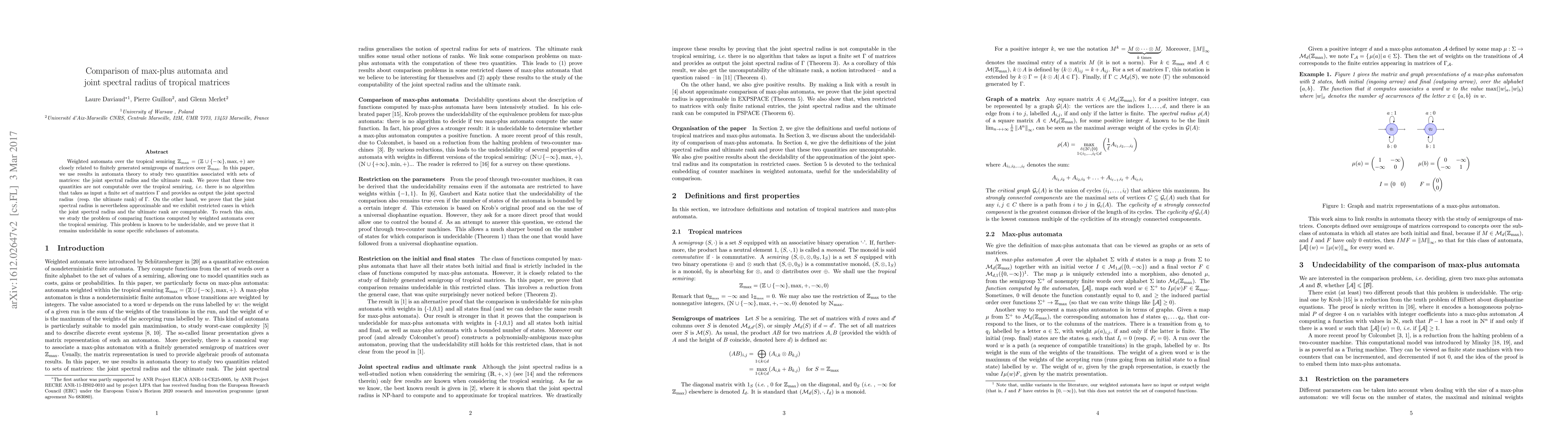 Weighted automata over the max-plus semiring S are closely related to finitely generated semigroups of matrices over S. In this paper, we use results in automata theory to study two quantities associated with sets of matrices: the joint spectral radius and the ultimate rank. We prove that these two quantities are not computable over the tropical semiring, i.e. there is no algorithm that takes as input a finite set of matrices M and provides as output the joint spectral radius (resp. the ultimate rank) of M. On the other hand, we prove that the joint spectral radius is nevertheless approximable and we exhibit restricted cases in which the joint spectral radius and the ultimate rank are computable. To reach this aim, we study the problem of comparing functions computed by weighted automata over the tropical semiring. This problem is known to be undecidable and we prove that it remains undecidable in some specific subclasses of automata.
