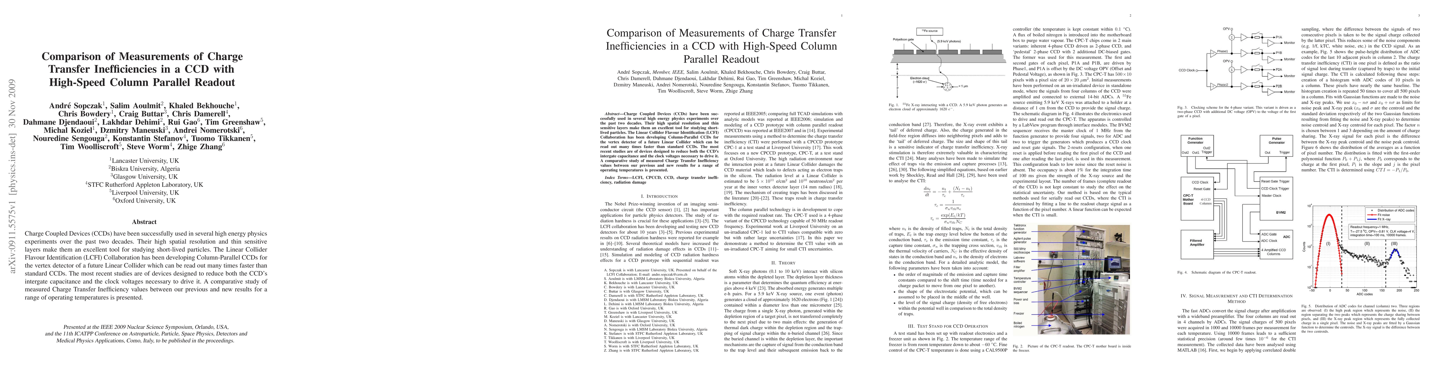 This paper compares charge transfer inefficiencies in CCDs with high-speed column parallel readout, focusing on new devices designed to reduce intergate capacitance and clock voltages. It presents a comparative analysis of efficiency measurements across different operating temperatures, highlighting improvements over previous models.