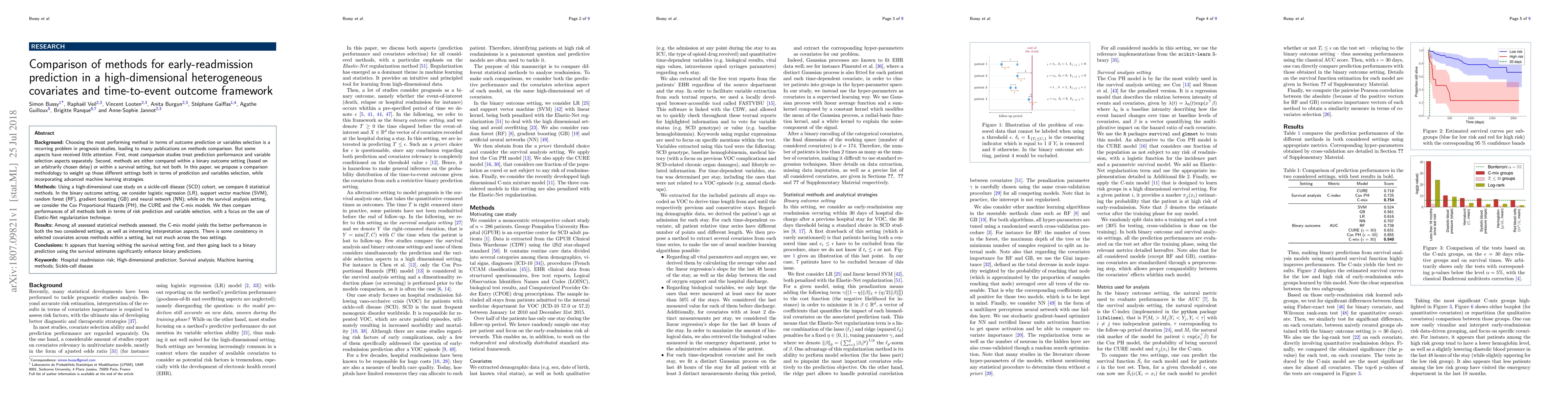 This research compares eight statistical methods for predicting early readmission in sickle-cell disease patients, using both binary outcome and survival analysis settings. The C-mix model outperforms others in both prediction and variable selection. Learning from survival data then applying it to binary prediction enhances results.