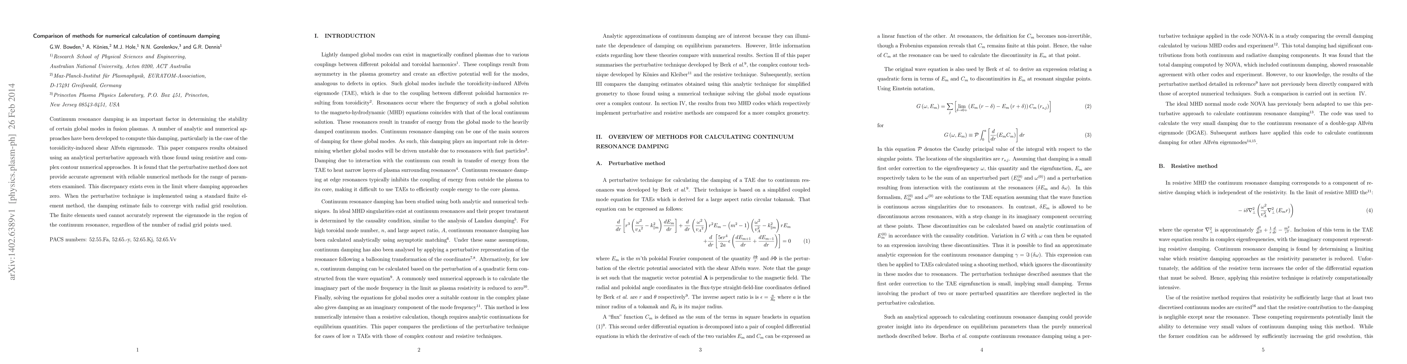 A comparison of numerical methods for calculating continuum damping in fusion plasmas found that an analytical approach was less accurate than resistive and complex contour numerical approaches, even at low damping levels.