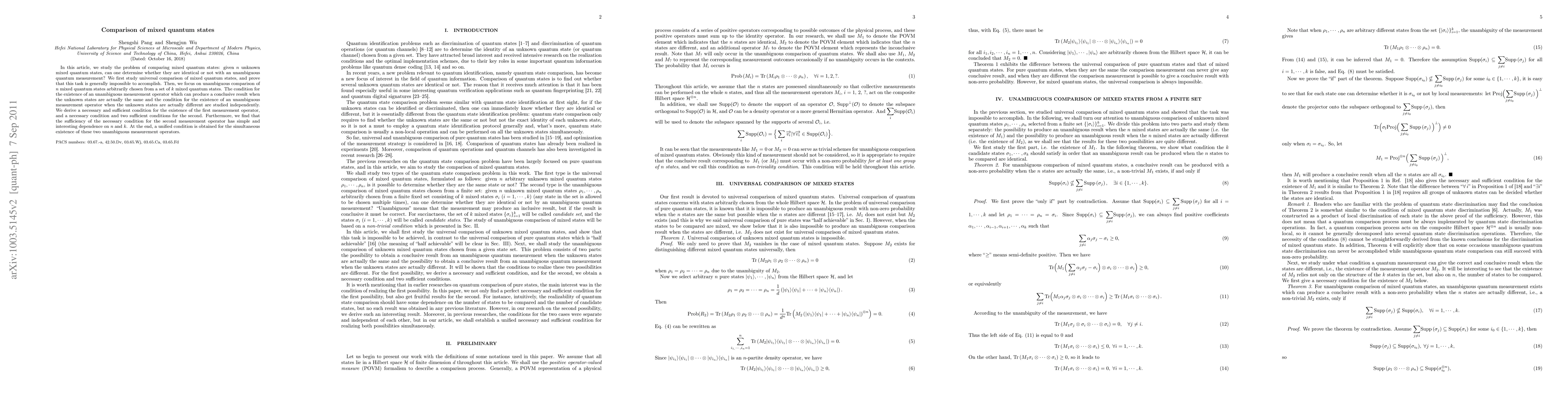 This paper explores the impossibility of universally comparing $n$ unknown mixed quantum states through unambiguous quantum measurements. It derives conditions for unambiguous comparison when states are chosen from a limited set, including a necessary and sufficient condition for one operator and necessary and sufficient conditions for another.