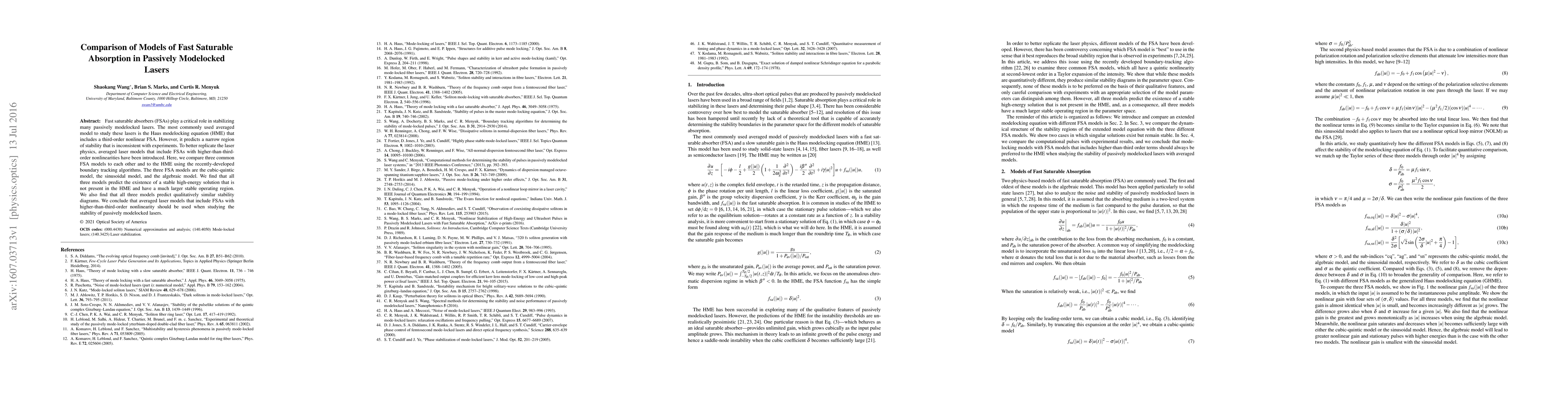 This paper compares three advanced fast saturable absorber (FSA) models—cubic-quintic, sinusoidal, and algebraic—against the traditional Haus modelocking equation (HME) to better predict the stability of passively modelocked lasers. The results show that all three FSA models predict a wider stable operating region and a stable high-energy solution, unlike the HME, suggesting the use of higher-order nonlinearity models for accurate laser stability studies.