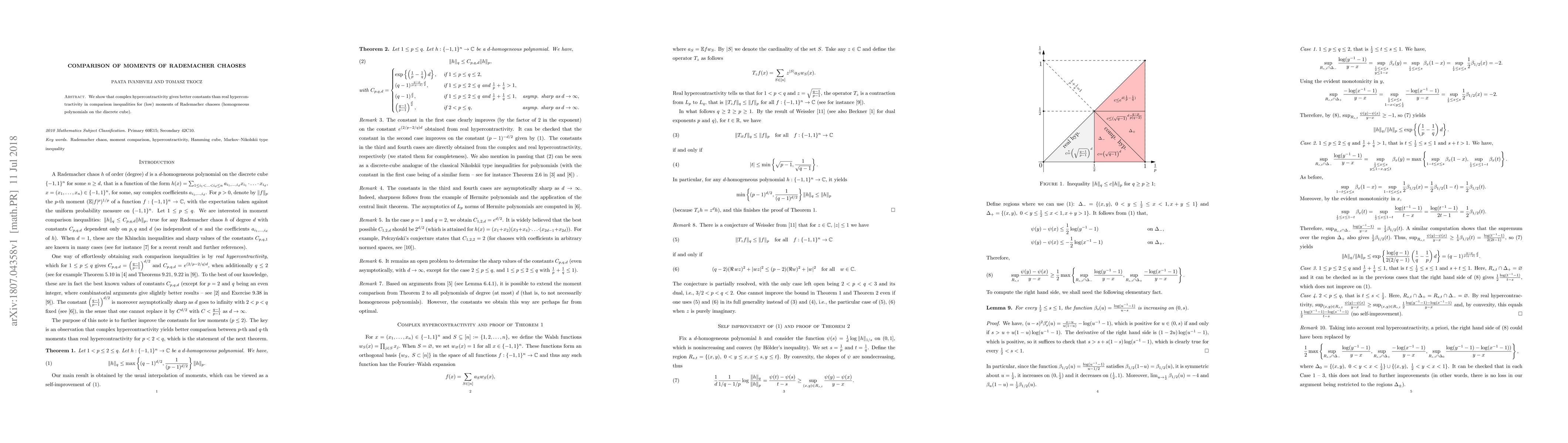Summary: This paper demonstrates that complex hypercontractivity provides superior constants compared to real hypercontractivity in establishing tighter bounds for low moments of Rademacher chaoses, which are homogeneous polynomials defined on the discrete cube.