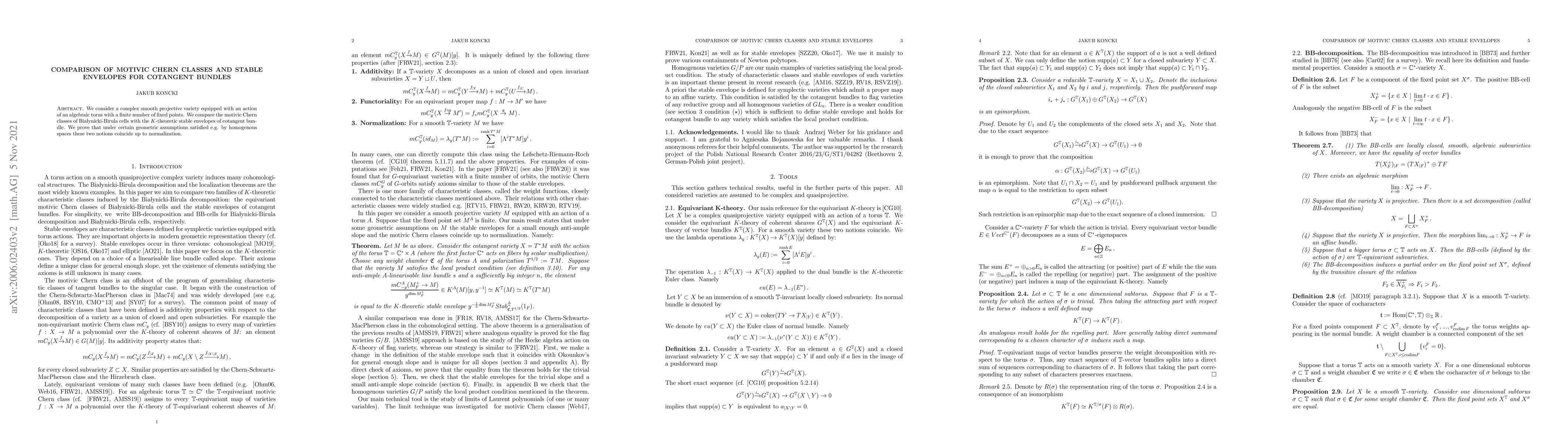 Summary: This paper investigates the relationship between motivic Chern classes of Białynicki-Birula cells and $K$-theoretic stable envelopes of cotangent bundles in smooth projective varieties acted upon by an algebraic torus, proving their equivalence under specific geometric conditions.