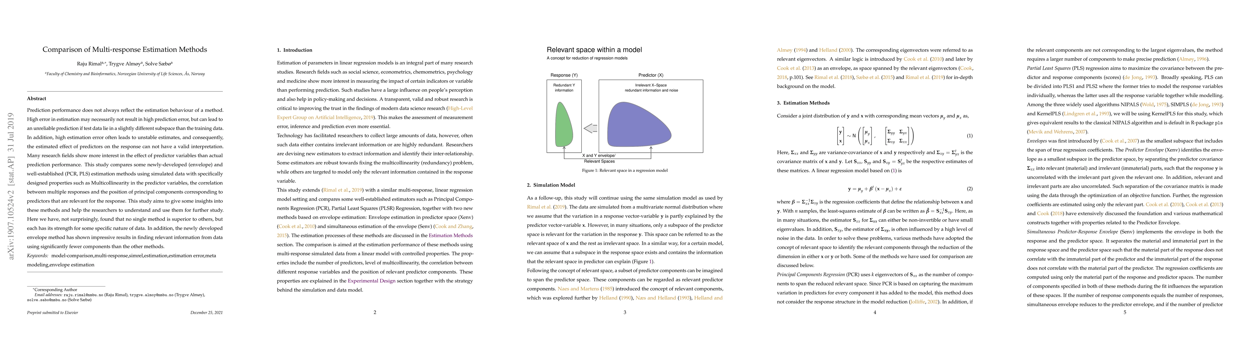 Prediction performance does not always reflect the estimation behaviour of a method. High error in estimation may necessarily not result in high prediction error, but can lead to an unreliable prediction if test data lie in a slightly different subspace than the training data. In addition, high estimation error often leads to unstable estimates, and consequently, the estimated effect of predictors on the response can not have a valid interpretation. Many research fields show more interest in the effect of predictor variables than actual prediction performance. This study compares some newly-developed (envelope) and well-established (PCR, PLS) estimation methods using simulated data with specifically designed properties such as Multicollinearity in the predictor variables, the correlation between multiple responses and the position of principal components corresponding to predictors that are relevant for the response. This study aims to give some insights into these methods and help the researchers to understand and use them for further study. Here we have, not surprisingly, found that no single method is superior to others, but each has its strength for some specific nature of data. In addition, the newly developed envelope method has shown impressive results in finding relevant information from data using significantly fewer components than the other methods.