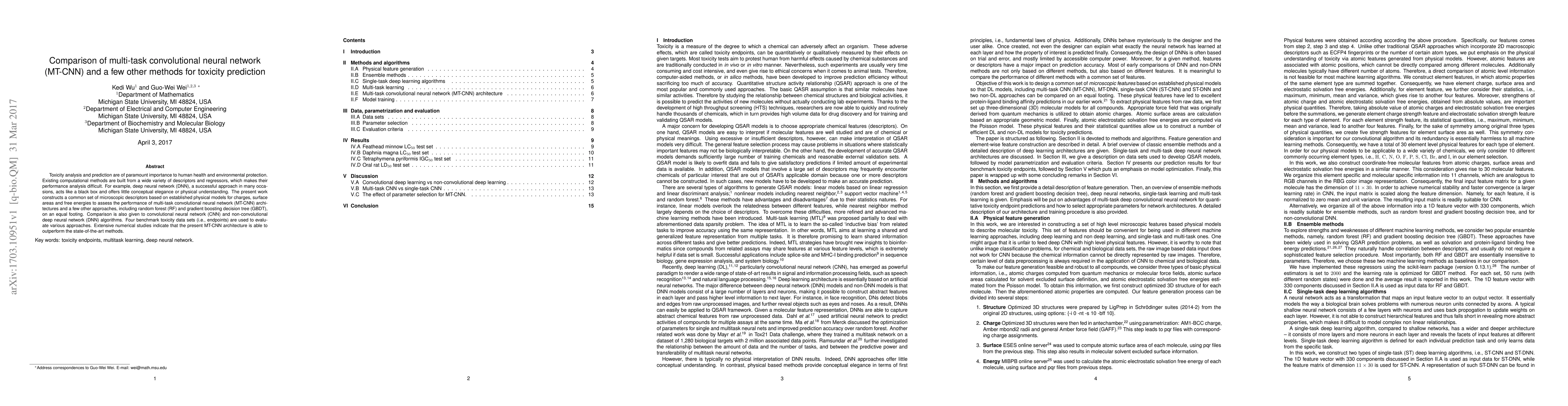 This research compares the performance of multi-task convolutional neural network (MT-CNN) architectures against other methods like random forest (RF) and gradient boosting decision tree (GBDT) for toxicity prediction. The study uses a common set of descriptors based on physical models to evaluate these approaches on four benchmark datasets, demonstrating that MT-CNN outperforms other algorithms, including CNN and non-convolutional deep neural networks (DNN).