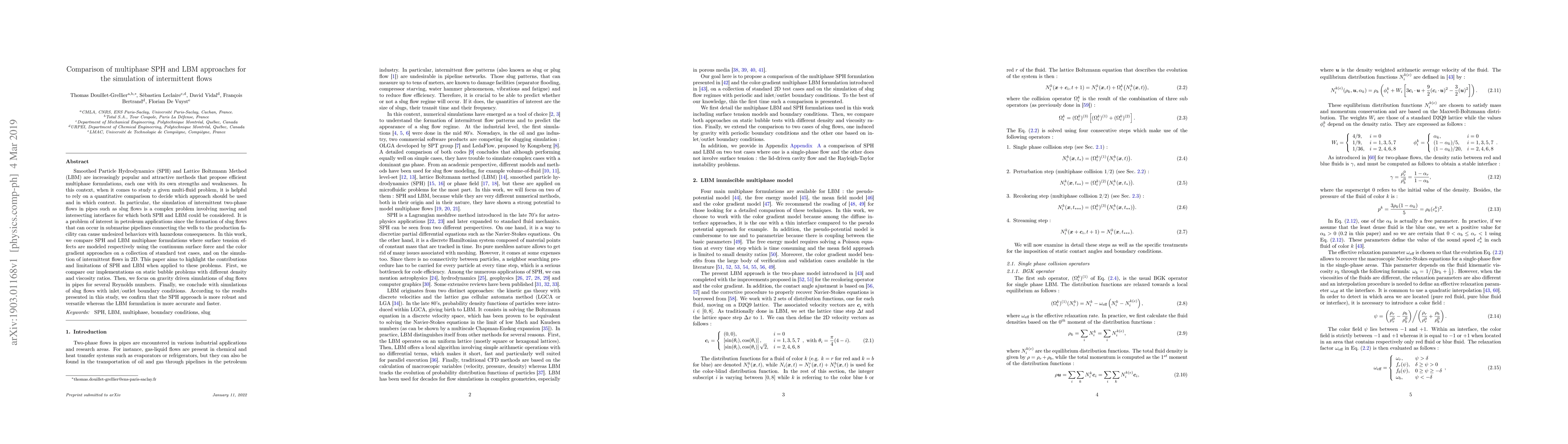 This paper compares the Smoothed Particle Hydrodynamics (SPH) and Lattice Boltzmann Method (LBM) for simulating intermittent two-phase flows in pipes, highlighting SPH's robustness and versatility, and LBM's accuracy and speed. The study evaluates both methods on standard test cases and slug flows simulations.