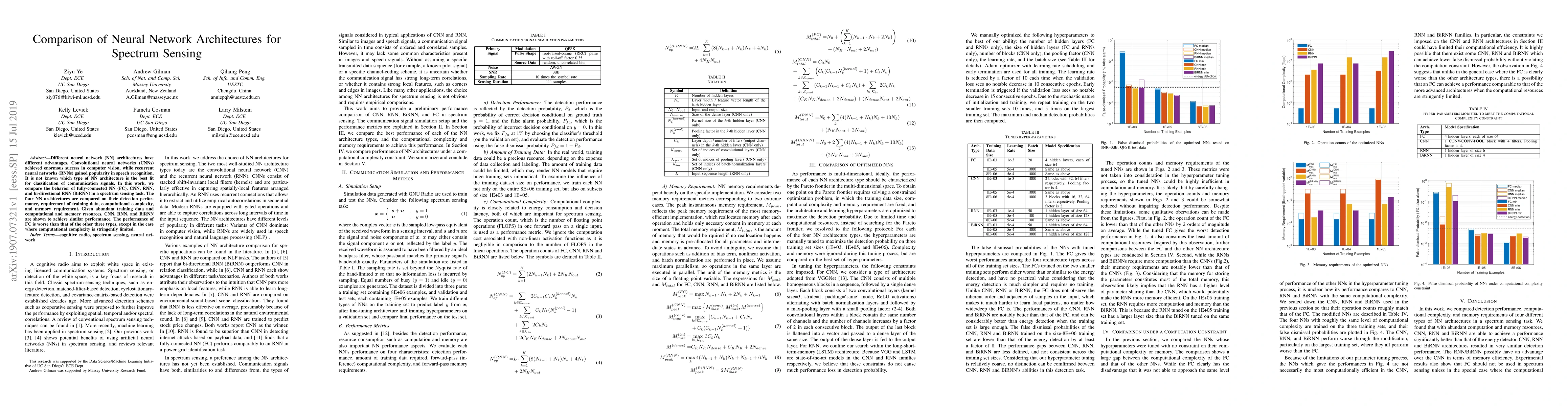 This research compares the performance of various neural network architectures—fully-connected, convolutional, recurrent, and bi-directional recurrent—for spectrum sensing tasks. The study evaluates detection performance, training data needs, computational complexity, and memory requirements, concluding that CNN, RNN, and BiRNN perform similarly with ample resources, while fully-connected networks lag behind unless computational constraints are severe. For detailed insights, refer to the original paper.