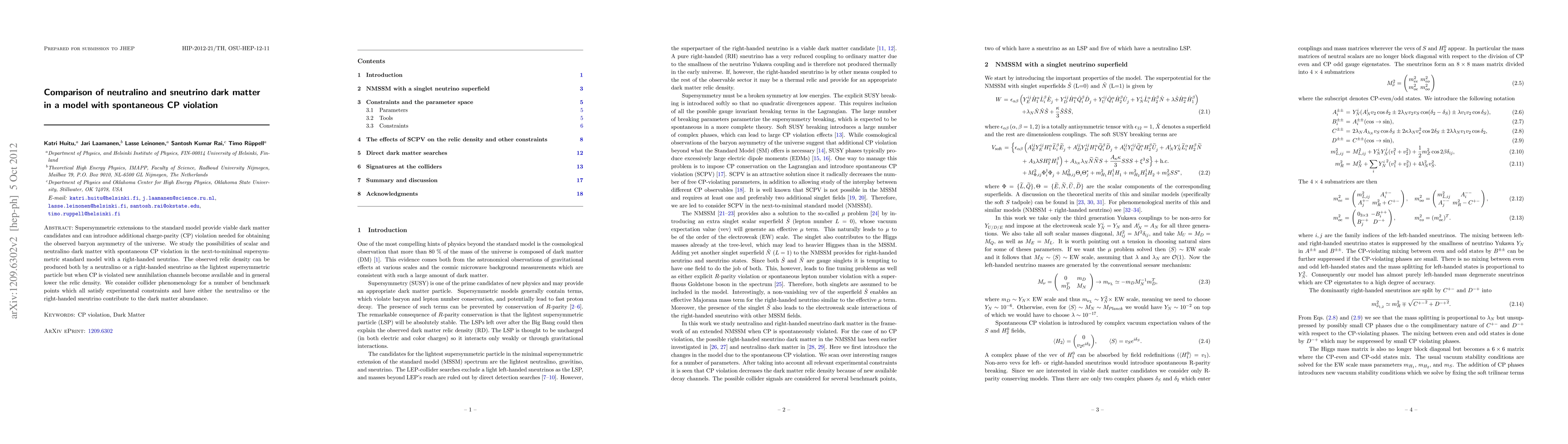 This paper compares neutralino and right-handed sneutrino dark matter candidates in a supersymmetric model with spontaneous CP violation, finding that while both can account for the observed relic density, CP violation introduces new annihilation channels that generally lower the relic density. It also examines collider phenomenology for benchmark points satisfying experimental constraints.