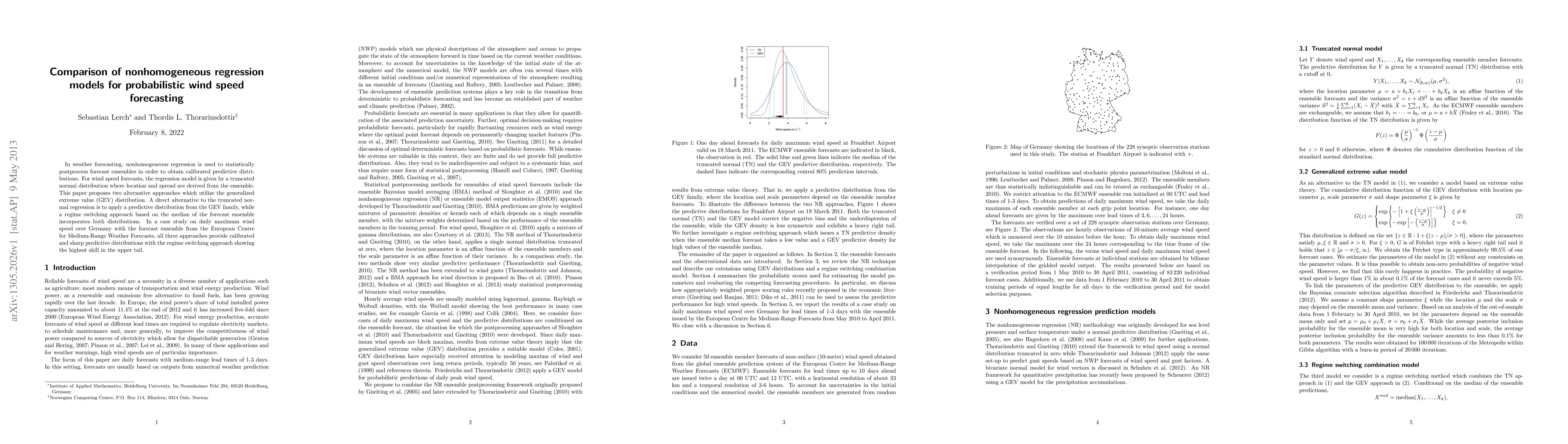 This paper compares nonhomogeneous regression models for probabilistic wind speed forecasting, proposing two alternatives based on the generalized extreme value (GEV) distribution. The regime switching approach, which incorporates both GEV and truncated normal distributions, shows the highest skill in forecasting the upper tail of daily maximum wind speeds in Germany.