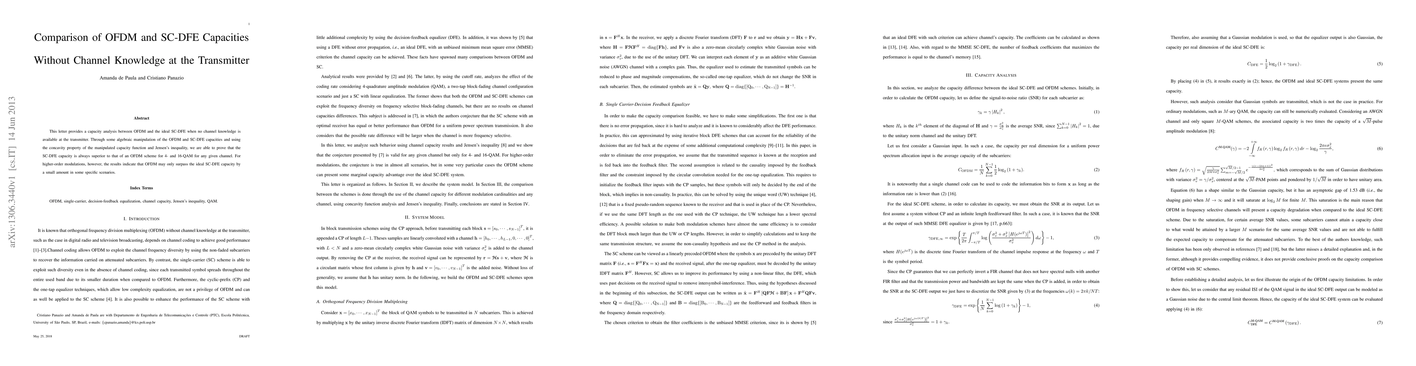 This letter provides a capacity analysis between OFDM and the ideal SC-DFE when no channel knowledge is available at the transmitter. Through some algebraic manipulation of the OFDM and SC-DFE capacities and using the concavity property of the manipulated capacity function and Jensen's inequality, we are able to prove that the SC-DFE capacity is always superior to that of an OFDM scheme for 4- and 16-QAM for any given channel. For higher-order modulations, however, the results indicate that OFDM may only surpass the ideal SC-DFE capacity by a small amount in some specific scenarios.